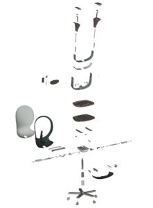 4. Fotel obrotowy, tapicerowane siedzisko i oparcie, tył oparcia i spód siedziska z tworzywa w kolorze białym, podstawa aluminiowa malowana na kolor biały, oparcie lędźwiowe, siedzisko przesuwne, bez podłokietników.