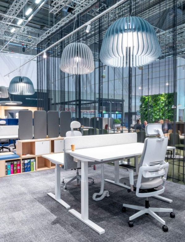 Ta lampa wisząca występuje w dwóch rozmiarach – dużej i bardzo dużej. Dzięki eleganckiemu językowi formy i miękkości materiału ta zwieszana oprawa zapewnia wysoką atrakcyjność wizualną w każdej przestrzeni biurowej – dodatkowo właściwości akustyczne klosza pochłaniającego dźwięki poprawiają komfort pracy. Koncepcja lampy opiera się na kształcie dzwonu z żebrowanym układem, który nadaje kloszowi elegancki i przestrzenny wygląd, a jakość paneli ecoPET tworzy przyjemną atmosferę w pomieszczeniu. Szeroki kąt rozsyłu światła oprawy zwieszanej umożliwia równomierne oświetlenie dużych powierzchni, a nieoślepiające światło jest odbierane jako wydajne i przyjemne dla oka.