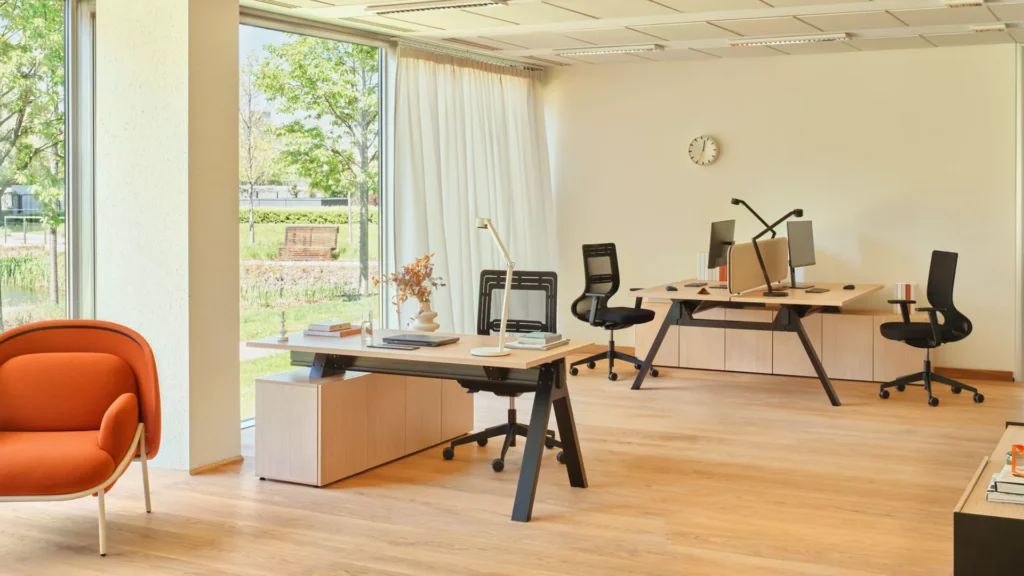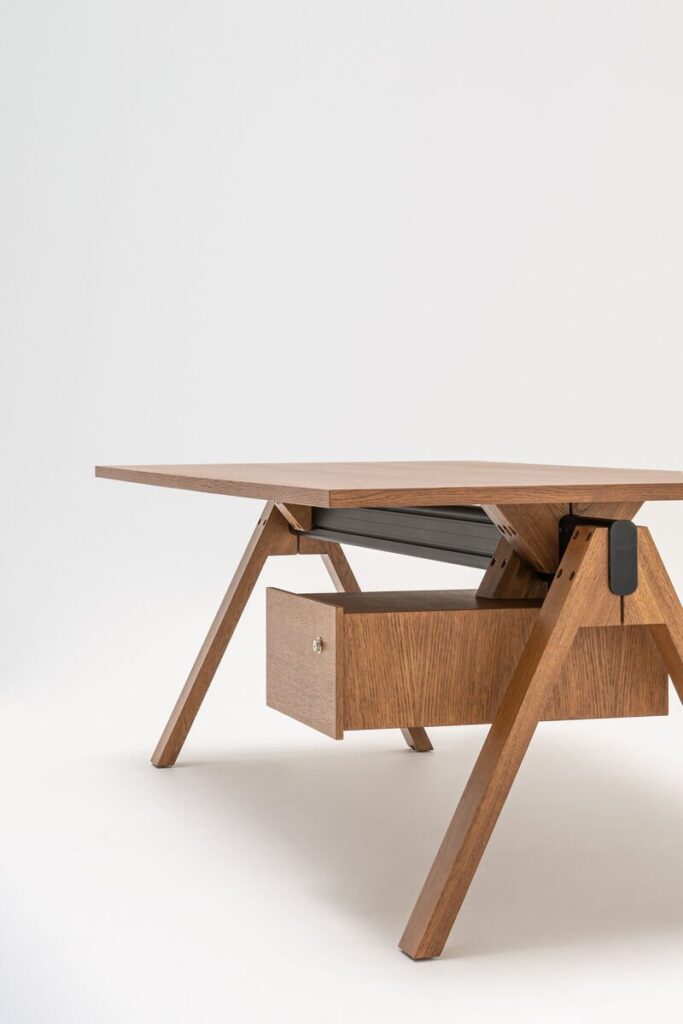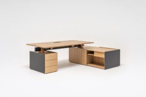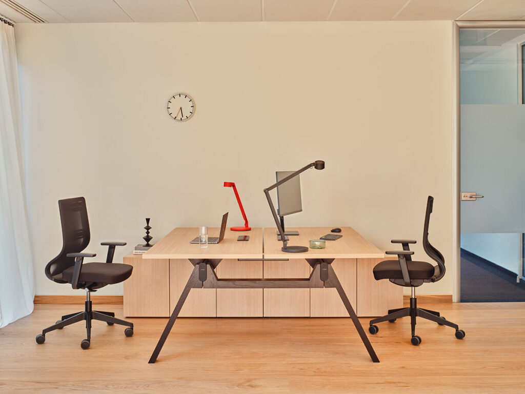 Wysoce funkcjonalne biurko gabinetowe Viga złożone jest z możliwie najmniejszej liczby elementów, dzięki czemu pozwala uniknąć zagracania przestrzeni.