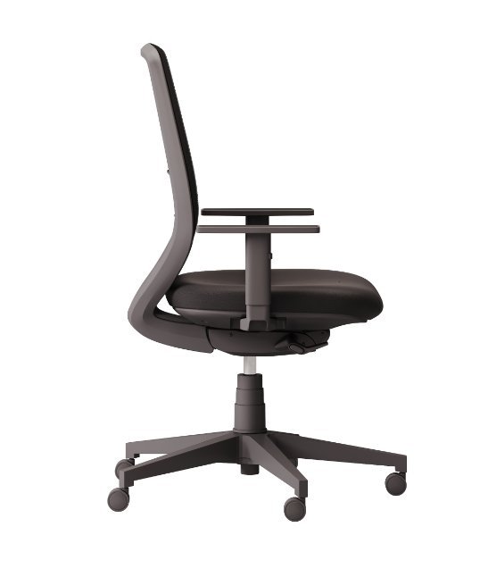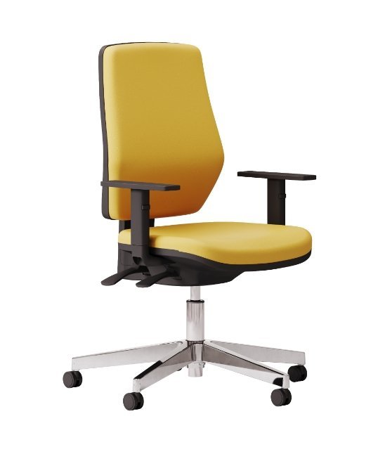 Fotel na pięcioramiennym krzyżaku, na kółkach, oparcie tapicerowane, podłokietniki czarne regulowane góra-dół, oparcie regulowane góra-dół. (Stelaż: polerowane aluminium lub z tworzywa czarnego.)