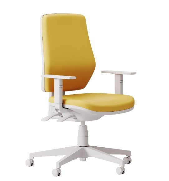 Fotel na pięcioramiennym krzyżaku, na kółkach, oparcie tapicerowane, podłokietniki białe regulowane góra-dół, oparcie regulowane góra-dół. (Stelaż: polerowane aluminium lub z tworzywa białego.)