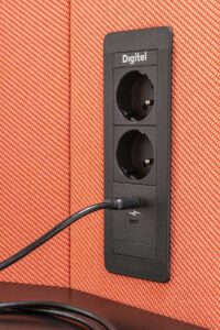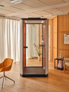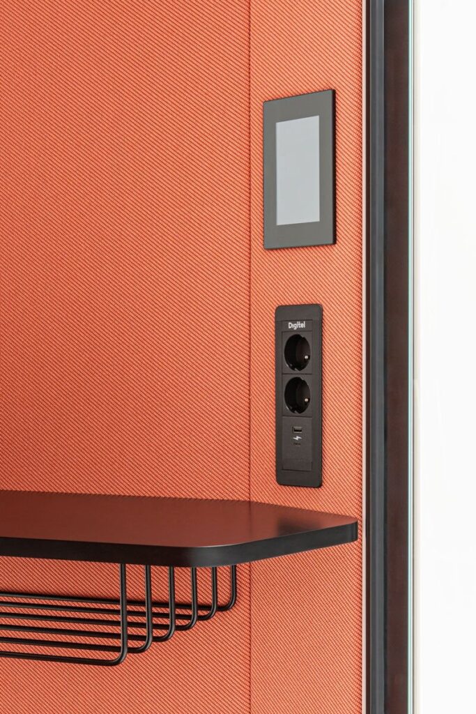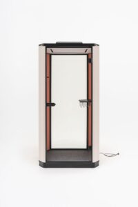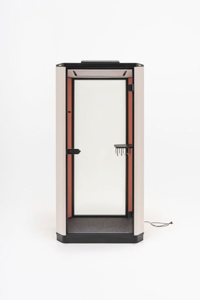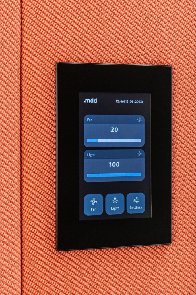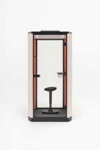 Nowoczesna budka stanowi połączenie funkcjonalności, estetyki i technologii, zapewniając ciszę i prywatność podczas rozmów telefonicznych, wideokonferencji i indywidualnej pracy w skupieniu. Zewnętrzne oświetlenie sygnalizuje dostępność budki, świecąc się na czerwono, gdy ktoś jest w środku. Sterowanie sygnalizacją umożliwia panel sterowania, powiązany również z systemami wentylacji i oświetlenia wewnętrznego. Użytkownik może regulować nawiew i jasność światła, dopasowując je do własnych potrzeb. Ciche wentylatory nie zakłócają rozmów ani skupienia, a stalowa konstrukcja harmonijnie komponuje się ze szklanymi i tapicerowanymi elementami pochłaniającymi dźwięk. Dzięki temu Coda sprawdzi się doskonale nawet w dynamicznych, głośnych i tętniących życiem wnętrzach.
