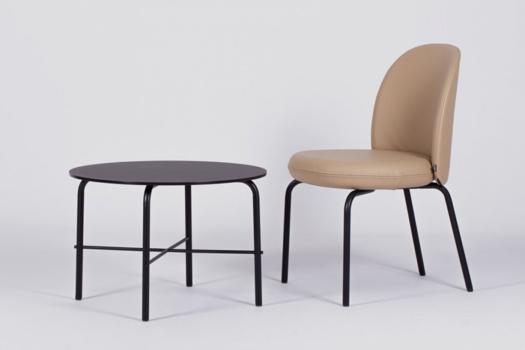 Konstrukcja malowana proszkowo, z wyborem kolorystyki według wzornika producenta. Stópki dopasowane do różnych rodzajów podłoża — miękkie lub filcowe na twarde powierzchnie.