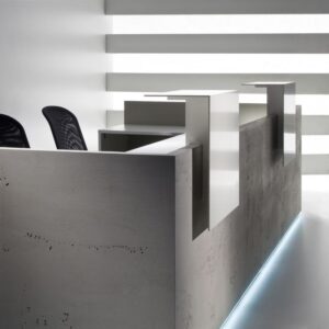 Kolor i faktura przypominająca zimny, szary beton przyciągają wzrok i zapadają w pamięć, a jednocześnie nie przytłaczają pomieszczenia. To starannie przemyślane połączenie współczesnego designu z funkcjonalnością. Czym wyróżnia się lada recepcyjna Furonto? Lada Furonto została tak zaprojektowana, aby z jej pomocą można było stworzyć przyjazny i profesjonalny kącik recepcyjny. A często to właśnie recepcja jest wizytówką danego miejsca, wpływającą na jego odbiór i pierwsze wrażenie, dlatego zdecydowanie warto starannie zaplanować całą jej aranżację.
