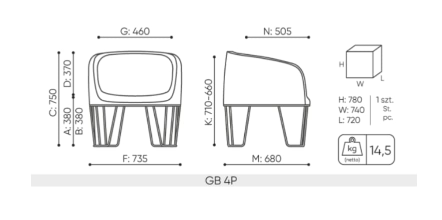 Wykorzystany materiał to tworzywo sztuczne, wytwarzane w technologii rotomouldingu, które gwarantuje trwałość, odporność na warunki atmosferyczne i długi okres eksploatacji, po upływie którego może być w pełni poddane recyklingowi. Siedziska dostępne są w pięciu kolorach: biały, szary, beżowy, szary-melanż oraz grafitowy-melanż. Dodatkowym wyposażeniem jest tapicerowana poduszka na siedzisko.