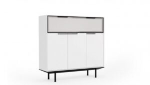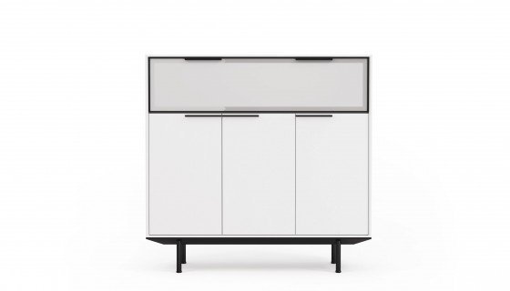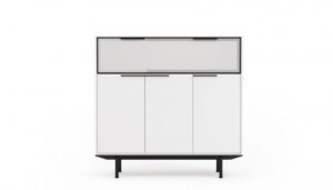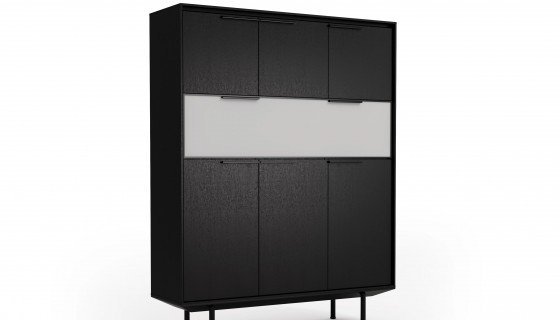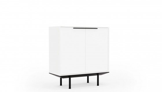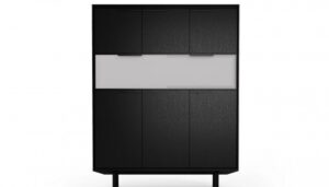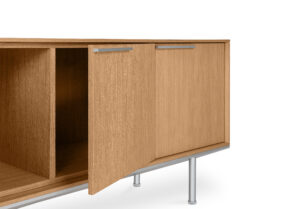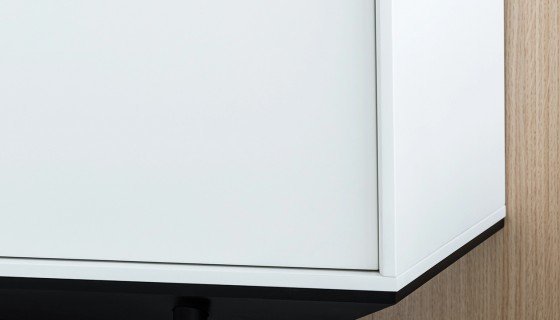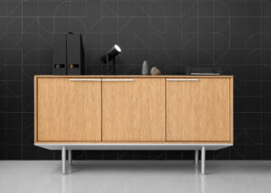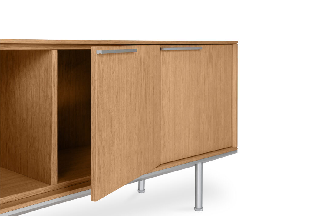 Do kolekcji mebli gabinetowych In należą także szafki, które osadzone są na aluminiowych podstawach i wysokich nóżkach, co podkreśla ich lekki i nowoczesny charakter. Dzięki zastosowaniu naturalnej okleiny oraz lakierowanej płyty MDF w pełnej gamie kolorystycznej według wzornika Balma, meble można łatwo dopasować do aranżacji każdego wnętrza.