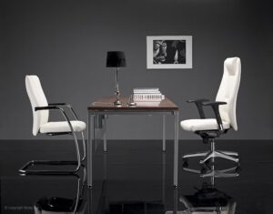 Ergonomiczne krzesło na metalowych płozach, przeznaczone do biur, eleganckich przestrzeni gabinetowych czy sal konferencyjnych.