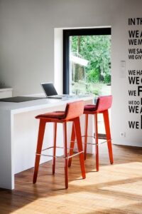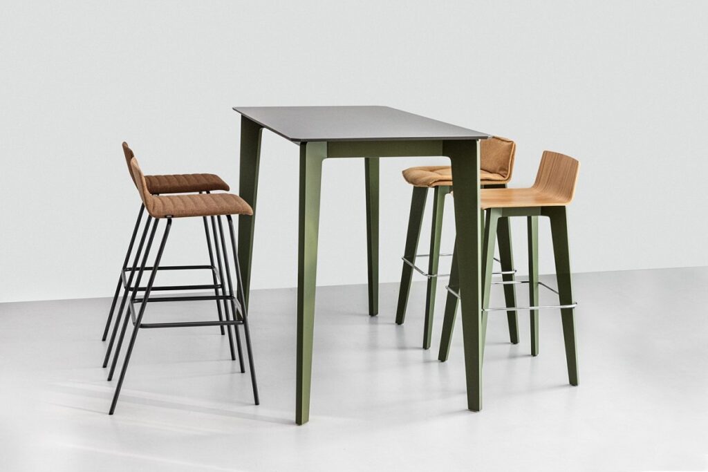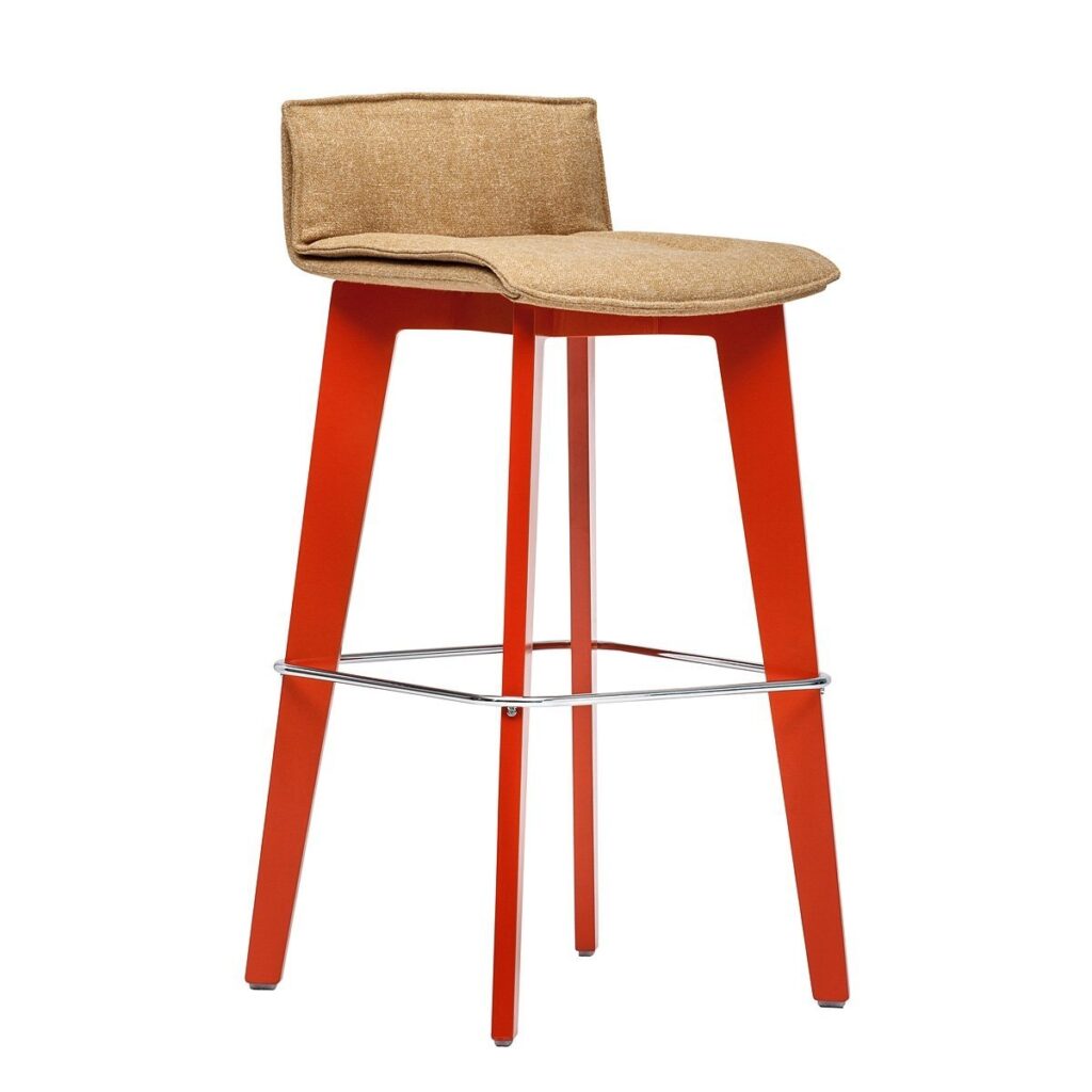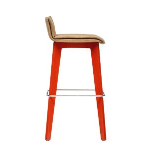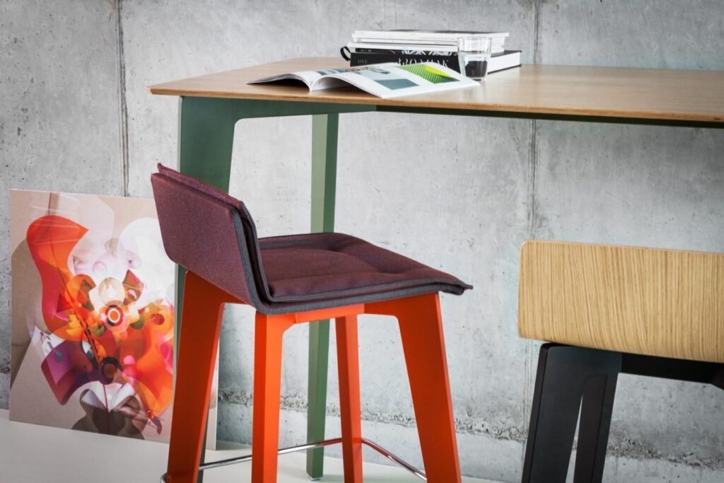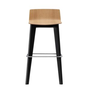Hokery mogą być dostawiane także w domowym salonie, do wysokiego stołu, przy którym pracujemy czy spożywamy posiłki. To hokery dumnie wznoszące się na dwóch parach wyrzeźbionych nóg, zgrabnie zwężających się ku dołowi. Oferowane są w trzech wersjach siedziska: z profilowanej sklejki pokrytej naturalną okleiną, ze sklejki w laminacie HPL lub dodatkowo tapicerowane z charakterystyczną poduszką zapewniającą komfort dłuższego siedzenia. Nogi hokera wykonane są ze sklejki bukowej.