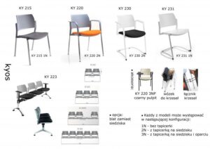 Możliwość zamontowania pulpitu, łączenia w rzędy, sztaplowania krzeseł i transportu ich na wózku to cechy zapewniające niezwykłą funkcjonalność. Dzięki temu KYOS doskonale sprawdza się zarówno w nowoczesnych salach konferencyjnych i szkoleniowych, jak i w małych biurach oraz recepcjach.