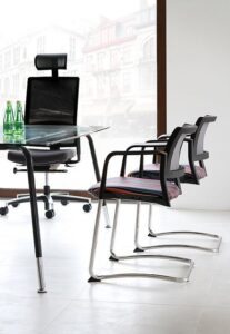 Możliwość zamontowania pulpitu, łączenia w rzędy, sztaplowania krzeseł i transportu ich na wózku, to cechy zapewniające niezwykłą funkcjonalność. Dzięki temu KYOS doskonale sprawdza się zarówno w nowoczesnych salach konferencyjnych i szkoleniowych, jak i małych biurach i recepcjach.