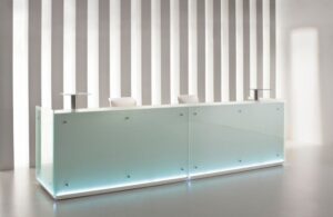 Możliwość dopasowania szerokości (od 2500 mm do 4100 mm) przy stałej głębokości 850 mm — elastyczność aranżacji recepcji.