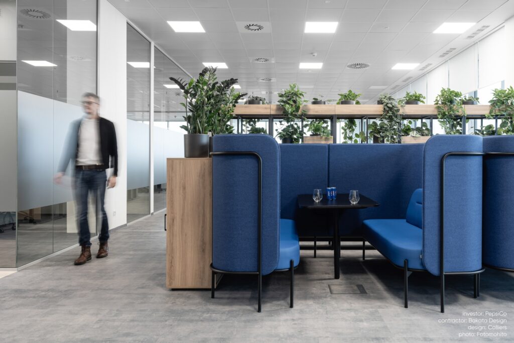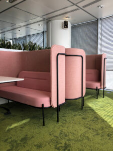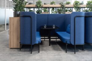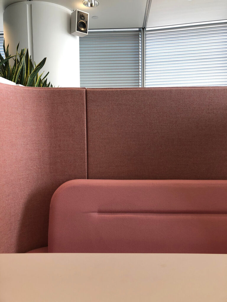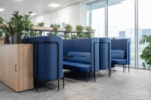 Tapicerowane panele redukują hałas, zapewniając prywatność spotkań i swobodną komunikację. Ergonomiczny układ z sofami i stołem sprzyja kreatywnej współpracy, a modułowa konstrukcja pozwala łatwo dopasować zestaw do charakteru biura.
