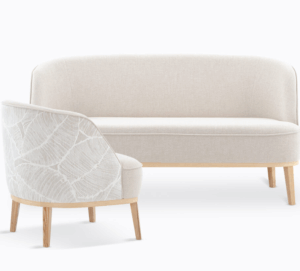 Sofa i fotel o delikatnie zaokrąglonych kształtach oraz harmonijnej linii oparcia i siedziska emanują spokojem i subtelnym wyrafinowaniem.