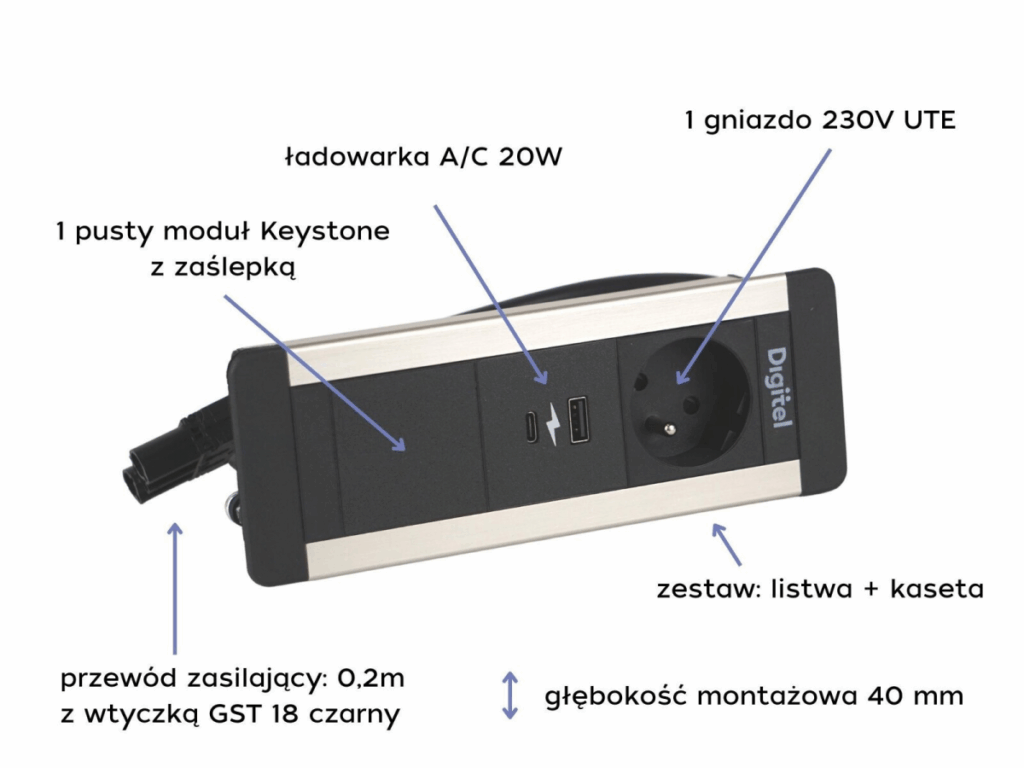 Ilość modułów mediaportu: 3 Ilość „pustych” modułów: 1 Ilość gniazd zasilających: 1 Gniazda USB: 1 x A | 1 x C