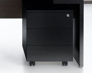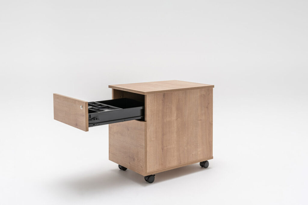 Pojemne szuflady wyposażone są w nakładany piórnik lub przegródki na teczki, które jeszcze bardziej ułatwiają organizację dokumentów i akcesoriów biurowych. Tworzywowe kółka czynią mebel mobilnym, dającym się łatwo przestawiać i dowolnie sytuować w pomieszczeniu. Kontenerek może być przystawiony do biurka, innej szafki lub ustawiony samodzielnie. Jako element serii składającej się z biurek, stołów i mebli do przechowywania, uzupełni spójną i gustowną aranżację całego pomieszczenia.