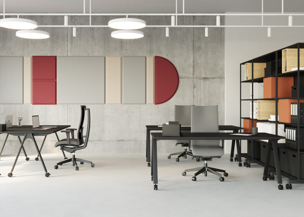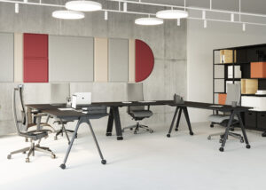 Mobilne biurka z systemu MULTIBASE, oparte na charakterystycznych nogach w formie litery A i wyposażone w kółka, idealnie wpisują się w potrzeby dynamicznych przestrzeni pracy.