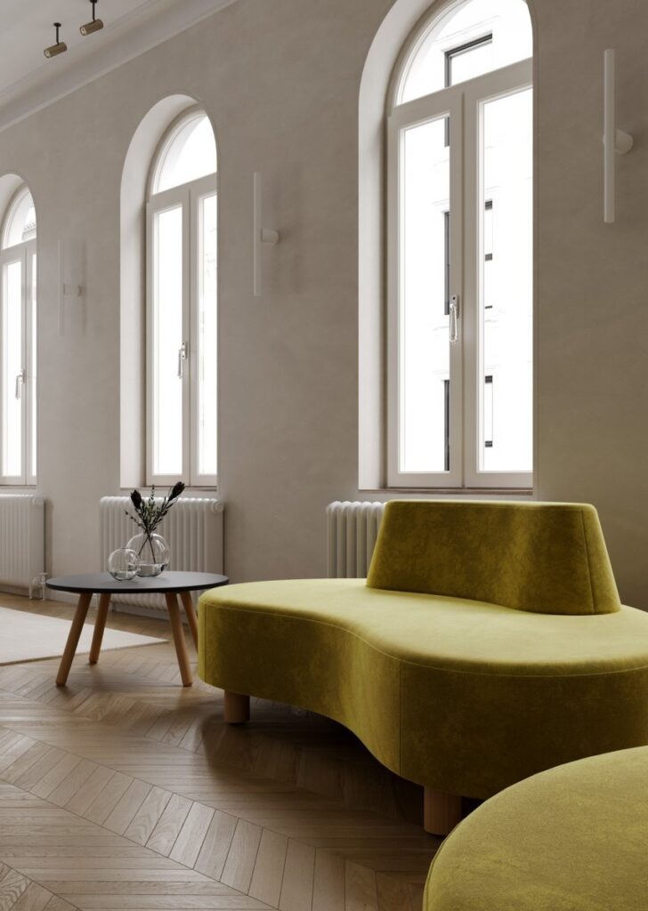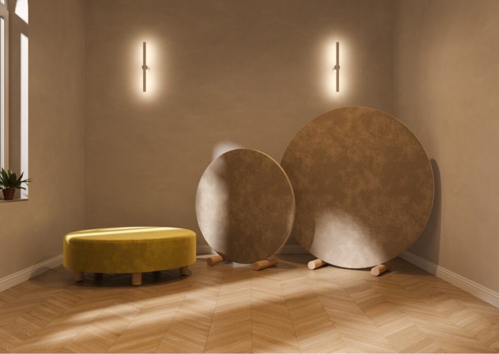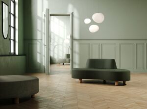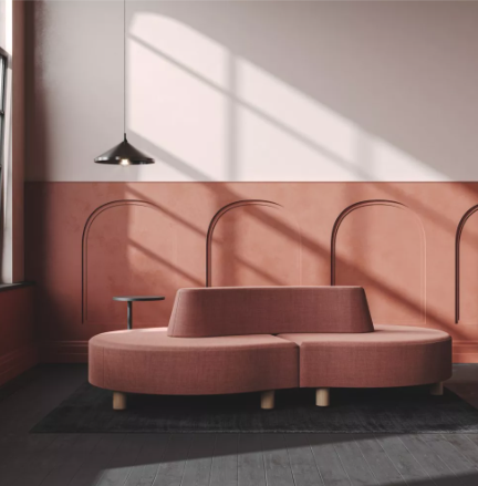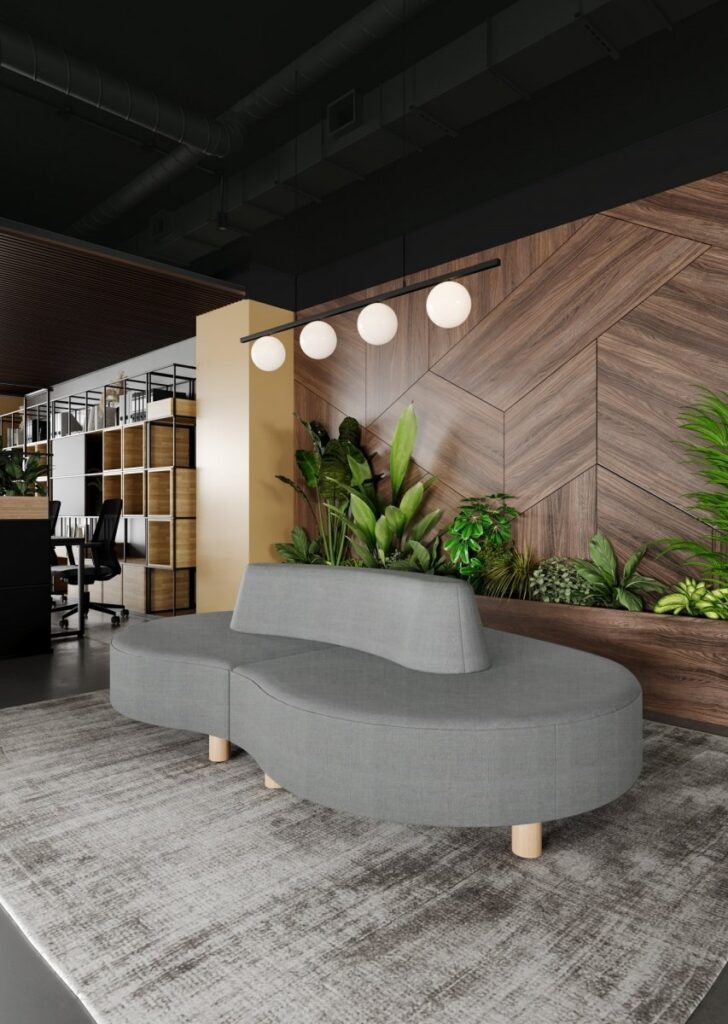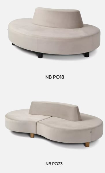 Elementy kolekcji NUBI: sofy, pufy oraz ścianki recepcyjne