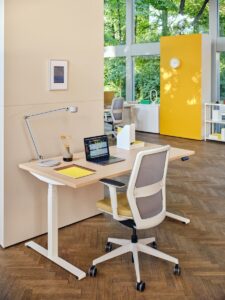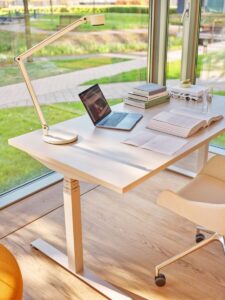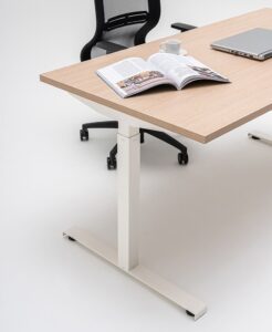 Mechanizm regulacji pozwala szybko dopasować wysokość blatu do indywidualnych potrzeb i wygodnie zmieniać pozycję z siedzącej na stojącą, co sprzyja zdrowej postawie i koncentracji. Cicha praca napędu, płynny start/stop oraz wbudowany system antykolizyjny podnoszą komfort i bezpieczeństwo użytkowania.