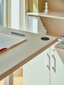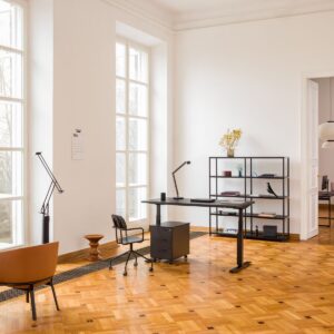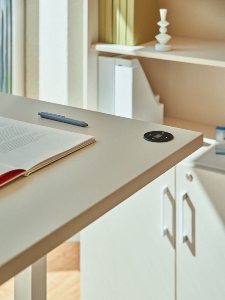Biurko można rozbudować o panele sterowania (w tym wersje z pamięcią 4 wysokości i regulacją czułości systemu antykolizyjnego), panel akustyczny, przepusty kablowe, wycięcie kablowe, top access oraz mediaboxy z gniazdami zasilającymi i portami komunikacyjnymi (USB/USB-C, RJ45, HDMI). Dostępne są także różne rodzaje stóp oraz regulowane stopki do poziomowania, co ułatwia dopasowanie mebla do przestrzeni pracy.