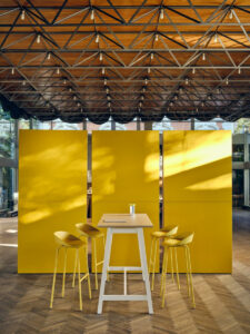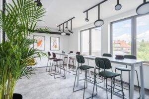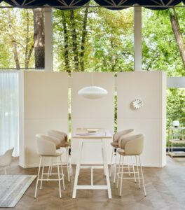 Wysoki stół zestawiony z hokerami doskonale sprawdzi się w strefach chill-out i lounge, tworząc komfortową przestrzeń do wyciszenia, regeneracji i krótkiego odpoczynku.