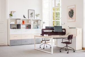 Nowoczesny design idealnie sprawdzi się w biurach typu coworking czy open space. Stanowiska pracy mogą być oddzielone od siebie panelem akustycznym, który użytkownikom da poczucie prywatności i poprawi akustykę w biurze. Porządek w miejscu pracy pozwolą utrzymać konternerki czy szafy przybiurkowe.