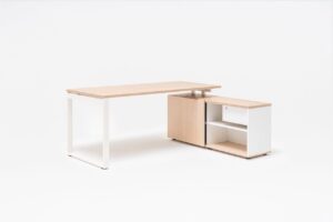 Geometryczny kształt daje wiele możliwości aranżacji przestrzeni pracowniczej, od home office po open space. Dzięki szafce managerskiej, dostępnej w dwóch wersjach, biurko zyskuje pełnię funkcjonalności i jeszcze bardziej ułatwia organizację pracy oraz utrzymanie porządku. Użytkownik może dopasować je do swoich potrzeb, wybierając pomiędzy szufladami lub przesuwanym frontem szafki, a także dobierając panel, mediabox lub akcesoria do zarządzania kablami.