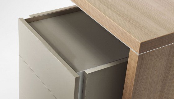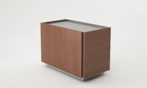 Mogą być wolnostojące lub służyć jako wsparcie biurka, zastępując tradycyjną szafkę. Dzięki wykończeniu i kolorystyce dopasowanej do pozostałych elementów kolekcji, kontenery harmonijnie komponują się z wnętrzem. Dostępne są w wersji z trzema szufladami lub z jedną szufladą i ramą kartotekową, ułatwiającą sprawną organizację dokumentów.