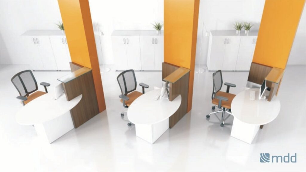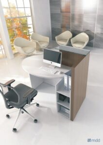Obniżony blat ułatwia komunikację z klientem w pozycji siedzącej, a wspólna część blatu roboczego ułatwia wypełnianie dokumentów oraz sprzyja bezproblemowej komunikacji. Podwyższona część lady kryje stanowisko komputerowe oraz pionową półkę na segregatory i dokumenty.