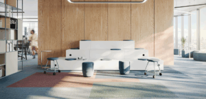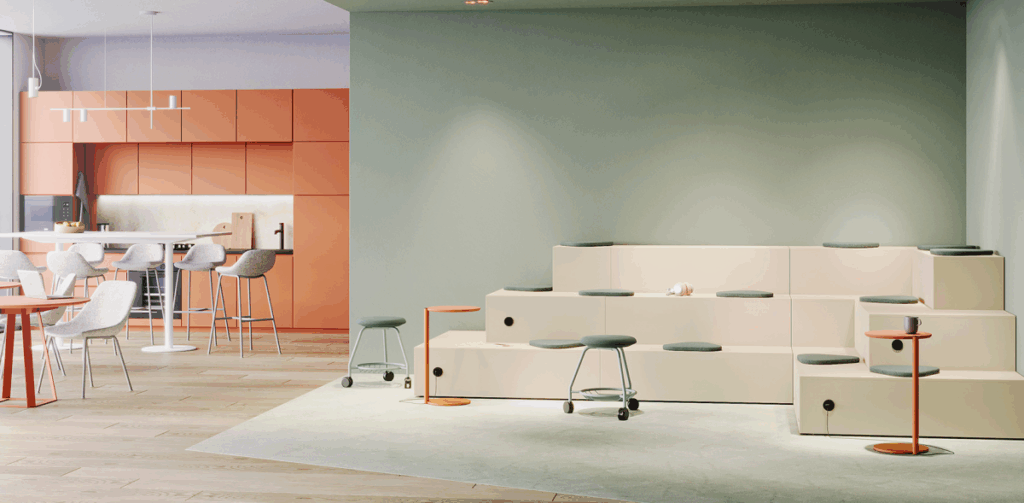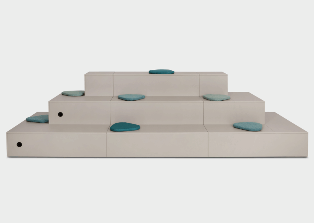PODIUM to modułowe, trzypoziomowe siedzisko, przeznaczone do użytku w przestrzeniach biurowych, publicznych oraz do nieformalnych spotkań.