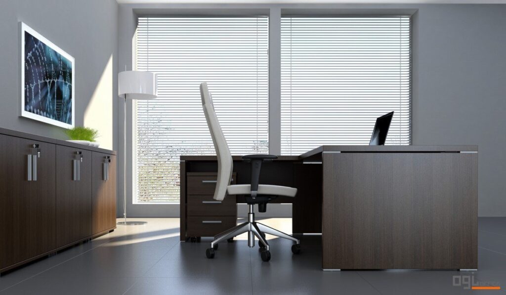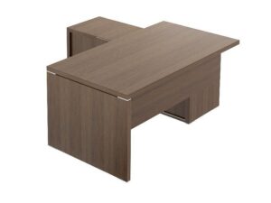 Biurka wyposażone są w proste i delikatne linie, które podkreślone są aluminiowymi elementami.