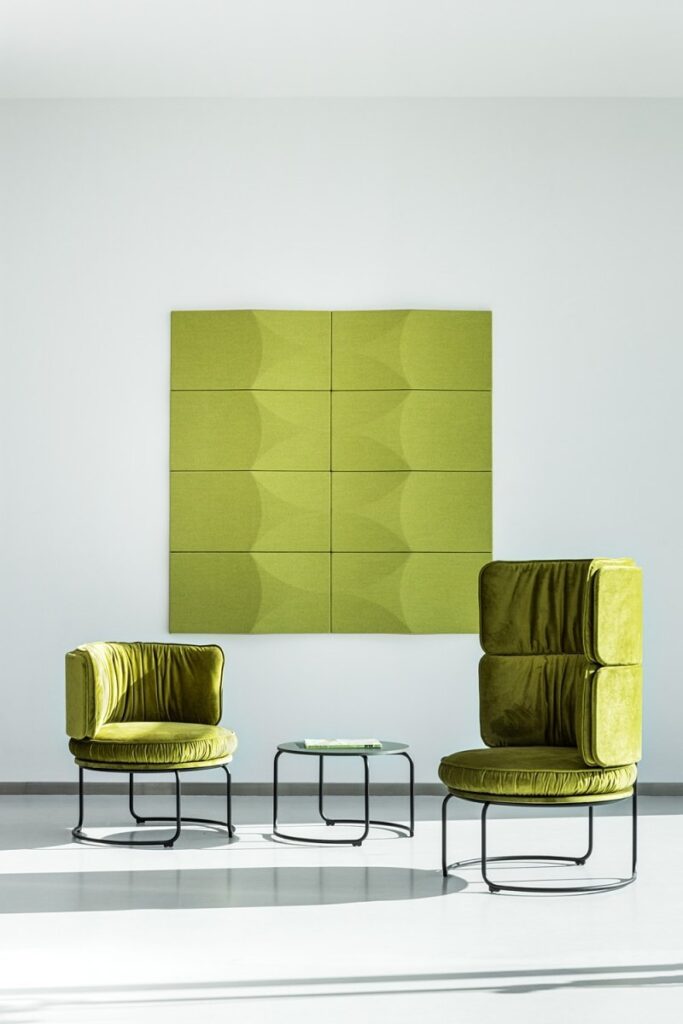 RING będzie doskonałym wyborem dla przestrzeni wspólnych biur, recepcji i foyer czy kawiarni. Dostępny jest on z niskim, tradycyjnym lub wysokim, loftowym oparciem, które dodatkowo zapewnia prywatność i ochronę akustyczną. Charakterystyczną cechą jest teatralny rys, modernistyczna podstawa bazująca na kształcie koła oraz wyraźne marszczenie tkaniny. RING posiada unikalny system sprężystego siedzenia i zbudowany jest stalowym stelażu. Mebel stworzony został z myślą o zrównoważonym rozwoju: konstrukcja umożliwia recykling elementów po okresie użytkowania, a siedzisko wykorzystuje odpady przemysłowe z pianki poliuretanowej.