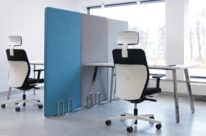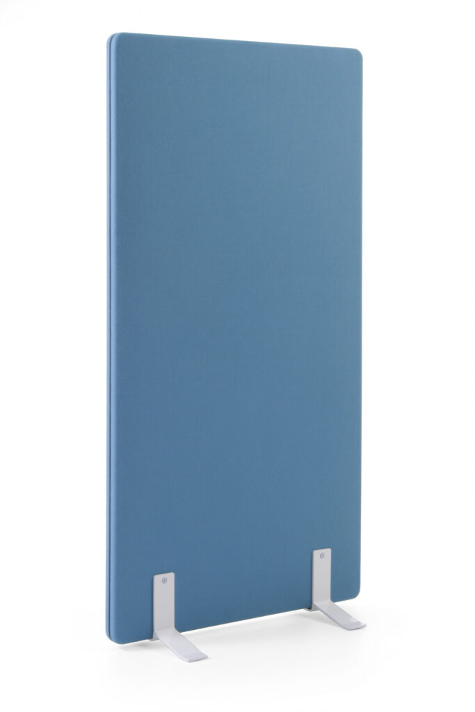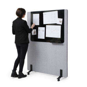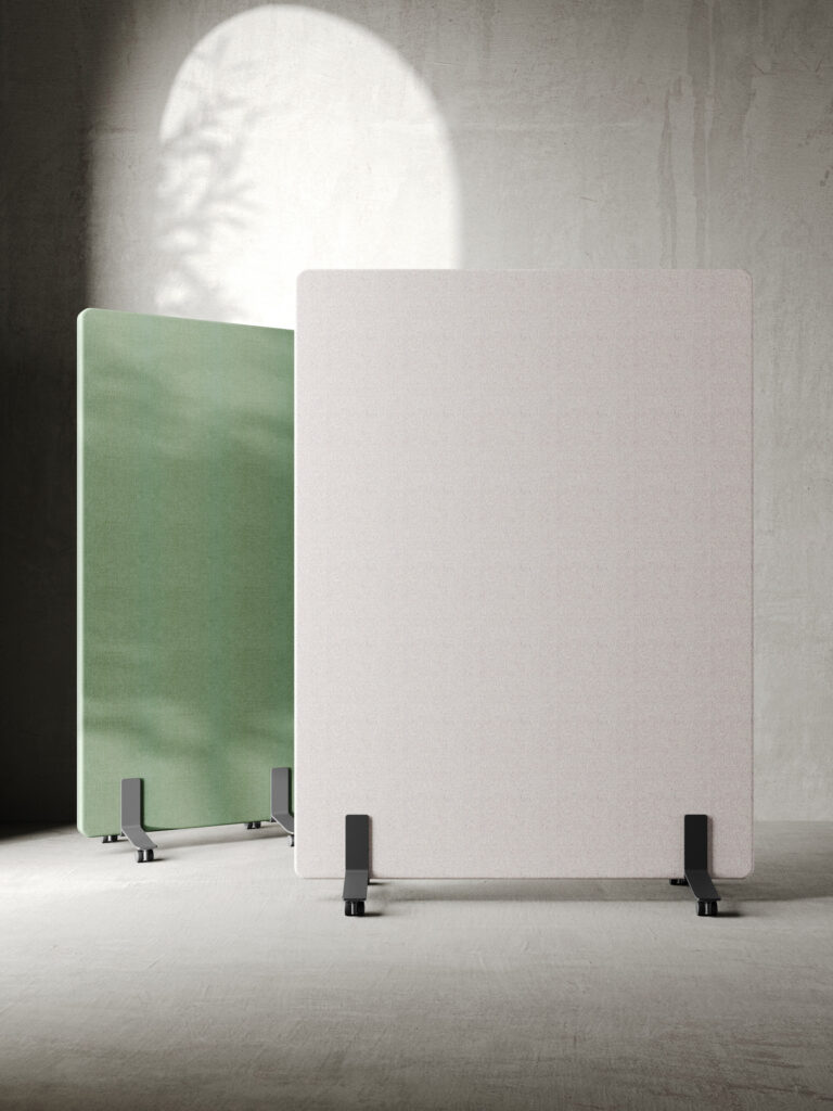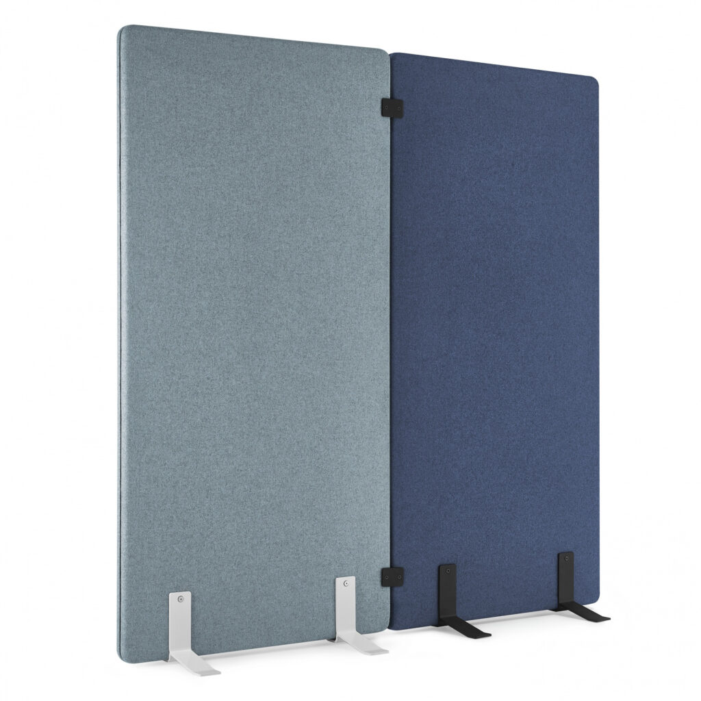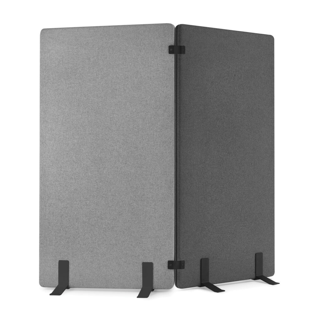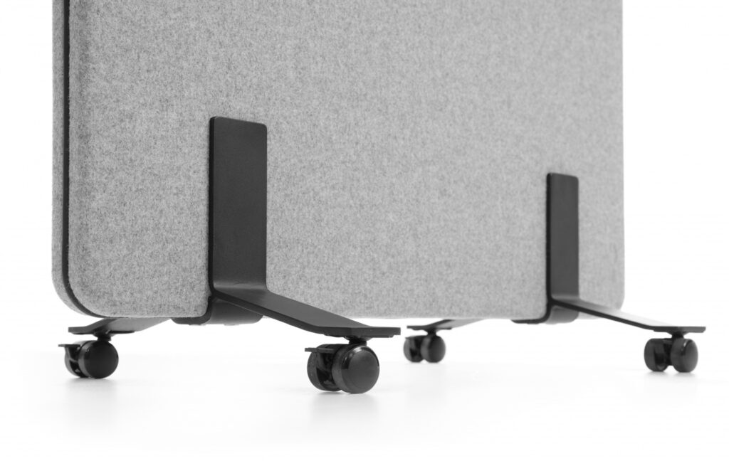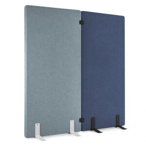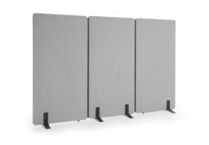 Ekrany są mobilne — wyposażone w wygodne podstawy także z kółkami z hamulcem — dzięki czemu łatwo je przestawiać i reorganizować przestrzeń bez konieczności montażu. Ich konstrukcja i materiały pochłaniają dźwięki generowane przez sprzęt biurowy, rozmowy czy odgłosy otoczenia, co pomaga ograniczyć hałas i pogłos, a tym samym zwiększa koncentrację i komfort pracy.