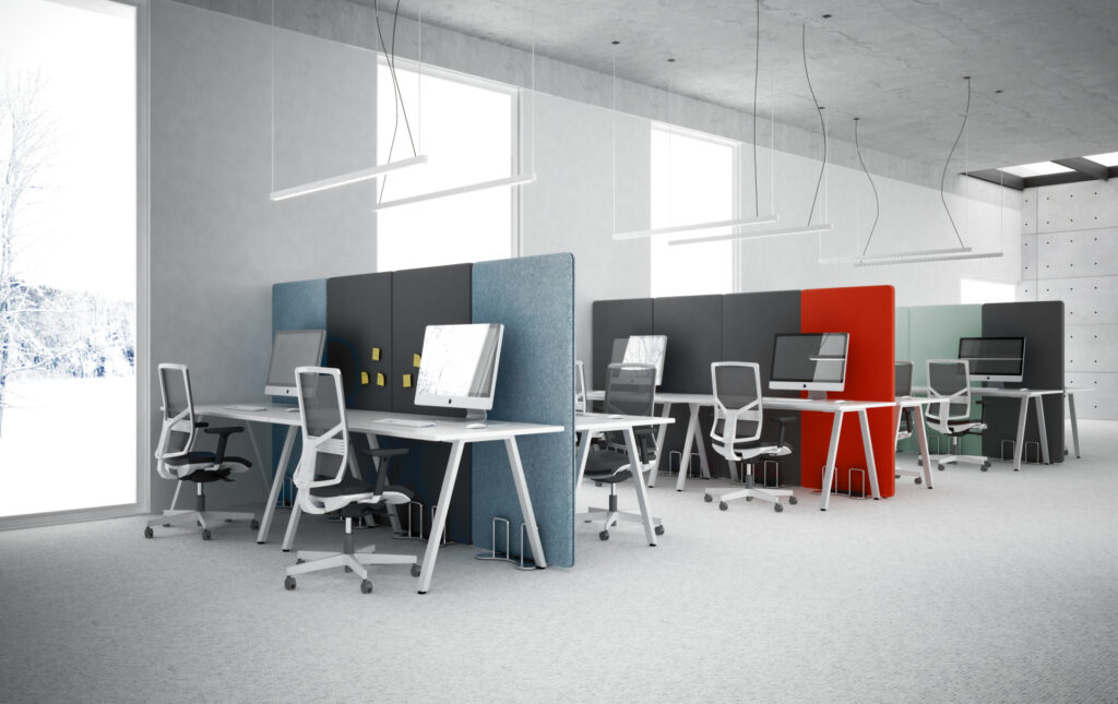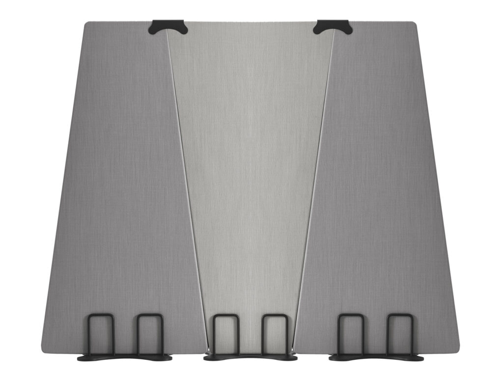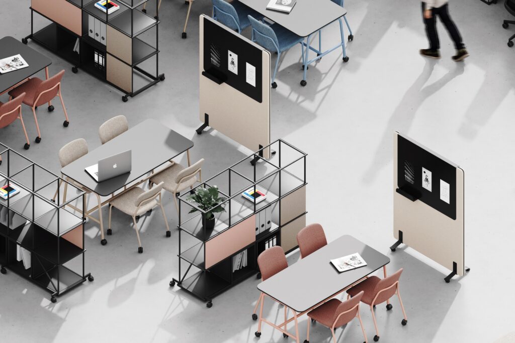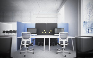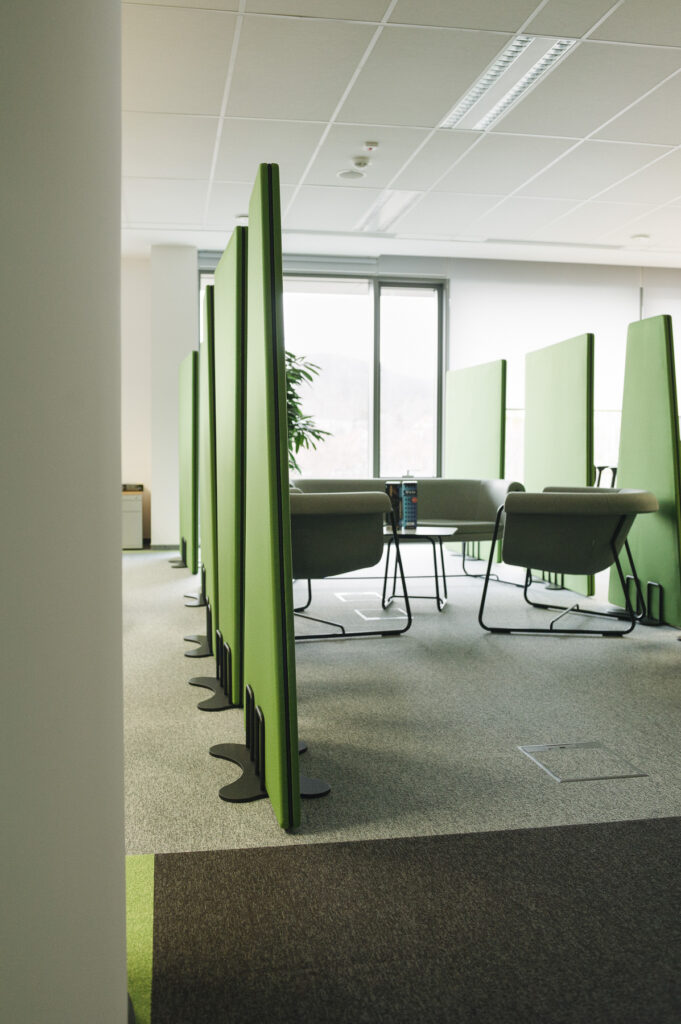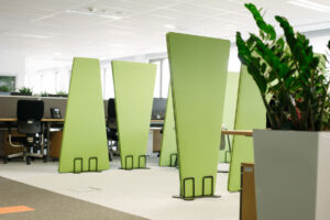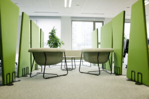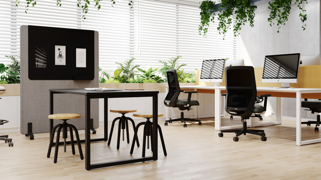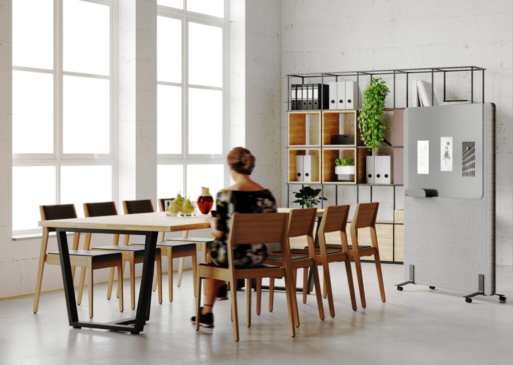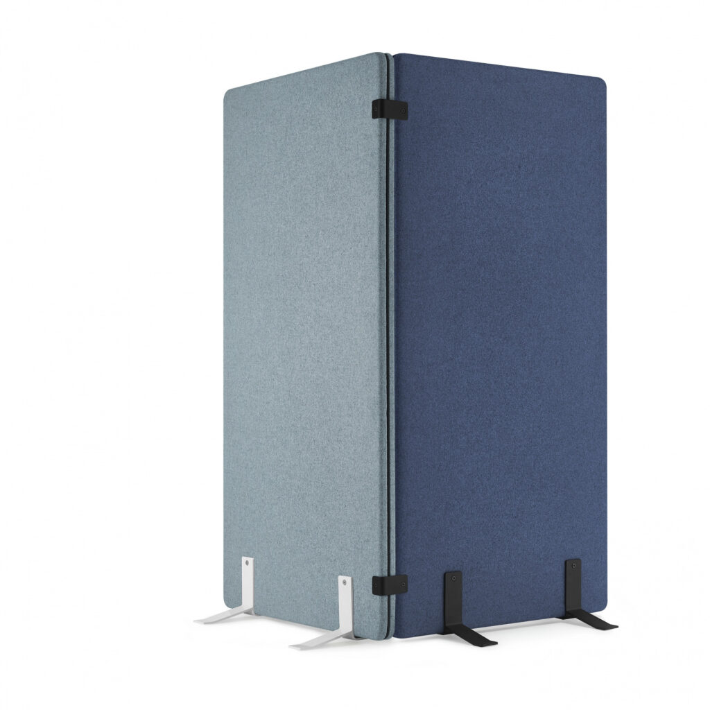 Ekrany są mobilne — wyposażone w wygodne podstawy także z kółkami z hamulcem — dzięki czemu łatwo je przestawiać i reorganizować przestrzeń bez konieczności montażu. Ich konstrukcja i materiały pochłaniają dźwięki generowane przez sprzęt biurowy, rozmowy czy odgłosy otoczenia, co pomaga ograniczyć hałas i pogłos, a tym samym zwiększa koncentrację i komfort pracy.