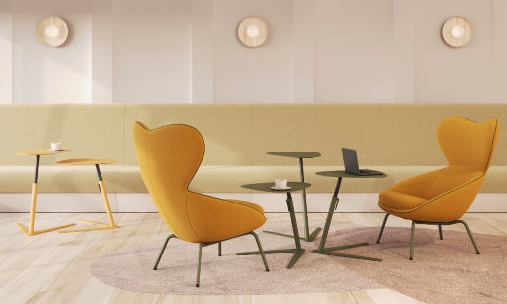 Stolik Semu to subtelny i funkcjonalny element wyposażenia, zaprojektowany tak, by adaptować się do różnych kontekstów użytkowania. Dzięki ręcznej regulacji wysokości idealnie sprawdza się zarówno jako stolik pomocniczy przy fotelu lounge, jak i jako blat roboczy przy krzesłach konferencyjnych.