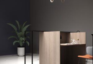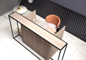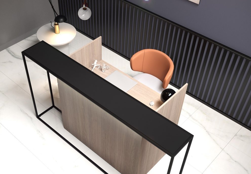 Mocne, geometryczne kształty lady SINTO zostaną zauważone w każdym wnętrzu. Jej front intryguje nie tylko dzięki wykorzystaniu wysokiej klasy materiałów, ale również przez możliwość zastosowania subtelnego światła LED. Funkcjonalne stanowisko pracy. Dobrze osłonięte stanowisko pracy w ladzie SINTO to gwarancja komfortu dla pracownika recepcji. Obniżona półka pod monitor zadba o ergonomię, a mediaporty i estetycznie poprowadzone okablowanie zapewnią optymalny dostęp do mediów.
