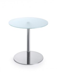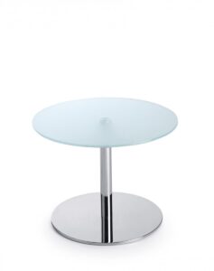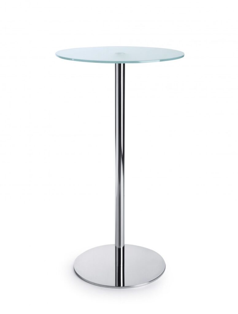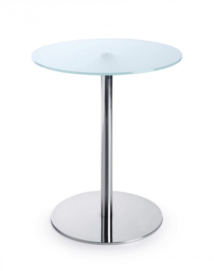 Każdy stolik wyposażony jest w okrągły blat o średnicy 600 mm, wykonany z hartowanego szkła w kolorze mlecznym (G1) o grubości 10 mm. Podstawa metalowa, okrągła, dostępna w trzech wariantach kolorystycznych: czarny, metalik (lakierowany proszkowo) oraz chrom (błyszczący), zapewnia stabilność i nowoczesny wygląd.