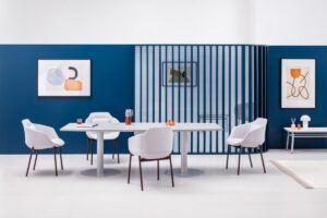 Szeroka gama stonowanych kolorów nadaje mu minimalistyczny charakter. Blat stołu dostępny jest w dwóch kształtach: owalnym oraz prostokątnym. Charakterystyczne nogi są przymocowane do blatu przy pomocy metalowego stelażu.