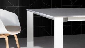 Ciekawy kształt nóg i stelaży stołów wykonanych ze szlachetnego anodowanego aluminium podkreślą prestiż każdego wnętrza. Blaty stołów są cienkie i wizualnie lekkie, a jednocześnie trwałe. Trapezowy profil nóg sprawia, że wygląd mebla zmienia się w zależności od przyjętej perspektywy.