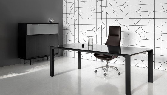 STOŁY KONFERENCYJNE IN Ikoniczny zestaw mebli gabinetowych IN w nowej odsłonie. Cienkie blaty z nowoczesnych materiałów, stelaże anodowane na czarno oraz szafki i komody osadzone na aluminiowych cokołach i wsparte na wysokich nóżkach. Dzięki temu meble uzyskały nową lekkość i nowoczesny wyraz.