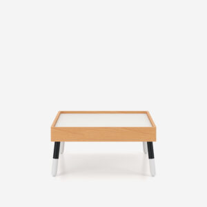 Blat stolika montowany jest w ramie wykonanej z litego drewna bukowego. Stolik wsparty jest na ramie metalowej, do której mocowane są nogi o przekroju okrągłym. Nogi wykonane są z drewna bukowego oraz profilu metalowego malowanego proszkowo w kolorze białym lub czarnym.