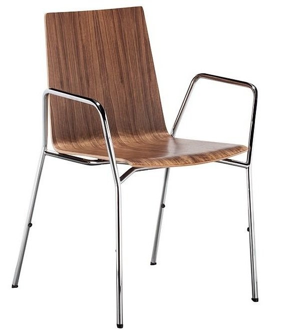 Krzesło gościnne bez podłokietników. Oparcie ze sklejki standardowo w okleinie dąb, w opcji w laminacie HPL w kolorze białym lub grafitowym, okleinie naturalnej: klon, orzech. Stelaż z rurki stalowej malowany proszkowo lub chromowany. Ślizgi do wykładzin dywanowych, w opcji do podłóg twardych. Możliwość sztaplowania krzeseł na stelażu 4-nożnym do 6 sztuk.