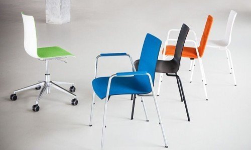Krzesło gościnne bez podłokietników. Oparcie z siedziskiem z profilowanego tworzywa w kolorze białym, czarnym lub srebrnym, wyklejane jednostronnie filcem przemysłowym z przodu w kolorach: zielony, niebieski, czerwony, szary melanż. Stelaż z rurki stalowej malowany proszkowo lub chromowany. Ślizgi do wykładzin dywanowych, w opcji do podłóg twardych. Możliwość sztaplowania krzeseł na stelażu 4-nożnym do 6 sztuk.