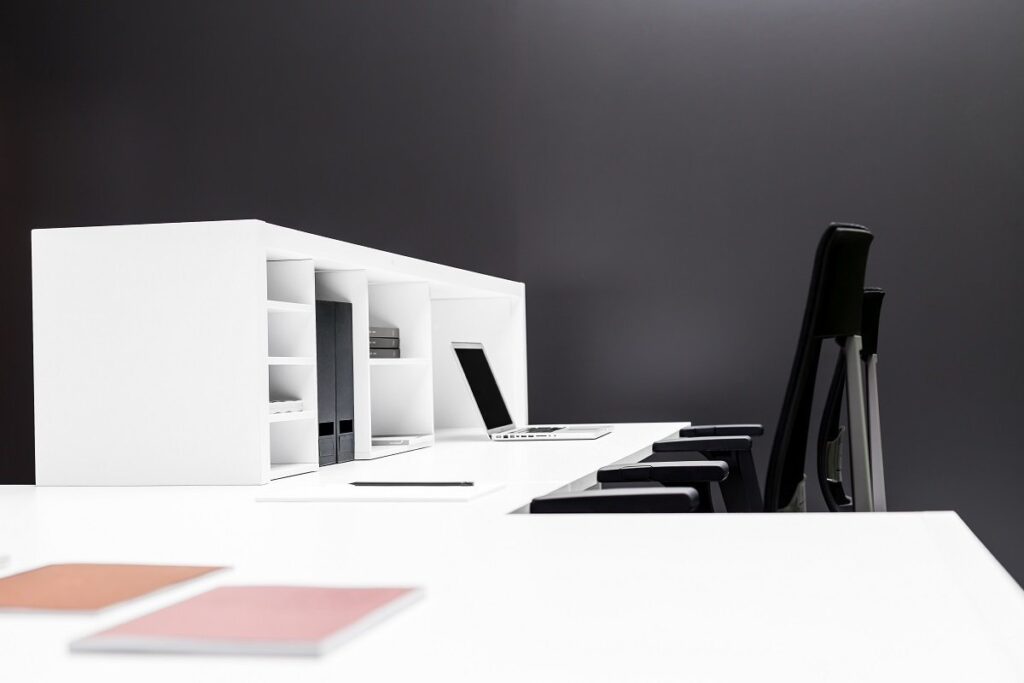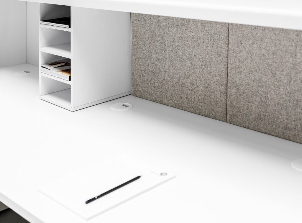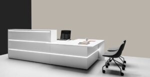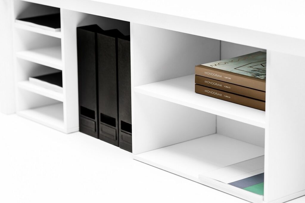 Dodatkową funkcjonalność zapewniają elementy wyposażenia wnętrza lady: mobilne półki na dokumenty oraz panele tapicerowane. Dzięki nim miejsce pracy jest dobrze zorganizowane. Możliwość zamontowania mediaportów oraz przepustów kablowych w blacie i poprowadzenia okablowania sprawia, że mebel staje się w pełni funkcjonalny i ergonomiczny. Lada występuje w dwóch wersjach: z oświetleniem lub bez oświetlenia.