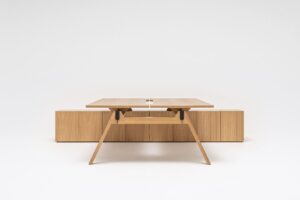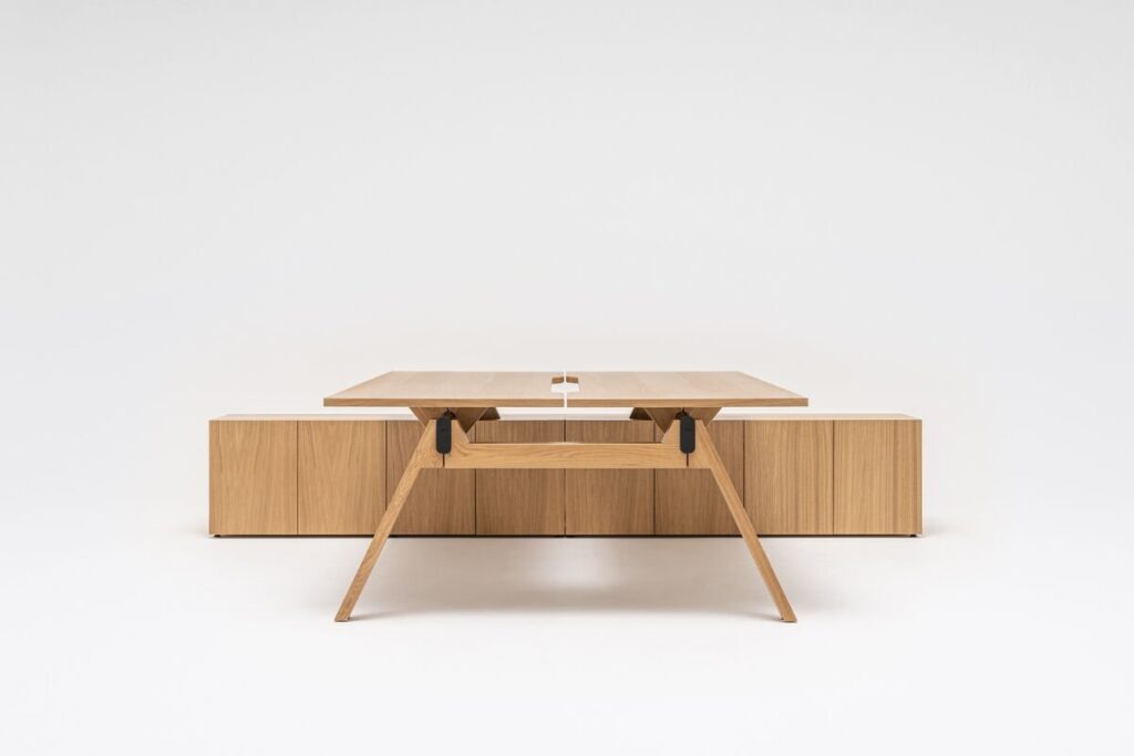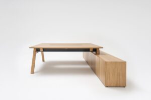 Nogi i blaty benchy dostępne są w trzech odcieniach okleiny dębowej oraz w eleganckim czarnym laminacie Fenix z powłoką Fingerprint-proof. Dwustanowiskowe biurka Viga stanowią punkt spotkania dla wysokiego poziomu ergonomii i przytulności stanowiska pracy.