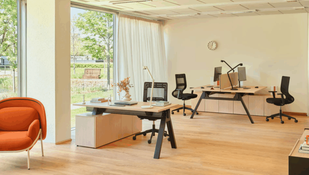 Biurka dwustanowiskowe Viga zapewniają szeroki wybór wielkości i opcji dla biur, które choć niewielkie, chcą pozostać stylowe i komfortowe.