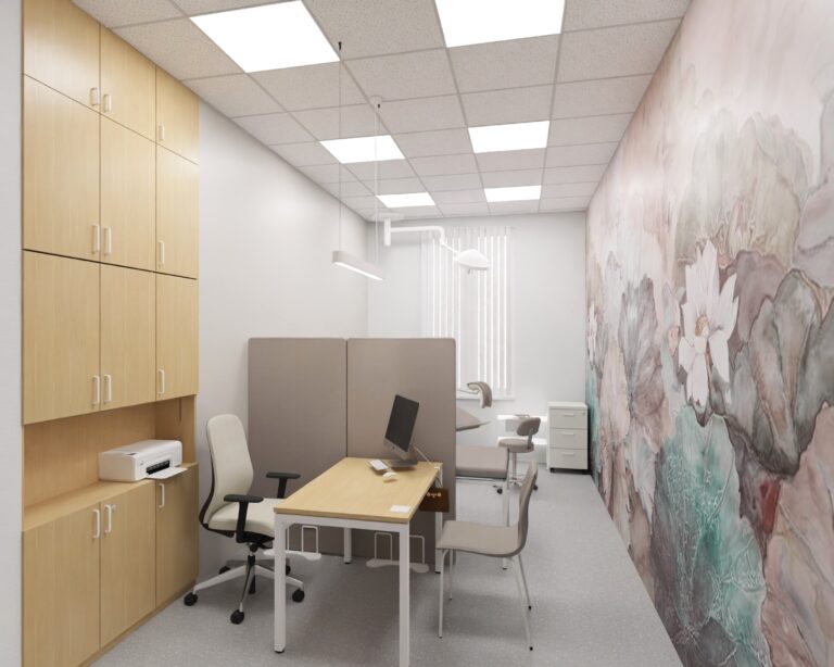 Projekt przychodni łączy nowoczesność z ciepłą, naturalną atmosferą. Jasne kolory, tapety z motywami roślinnymi i ergonomiczne meble tworzą przyjazną przestrzeń, która łagodzi stres pacjentów. Przemyślany układ pomieszczeń ułatwia codzienną pracę personelu.
