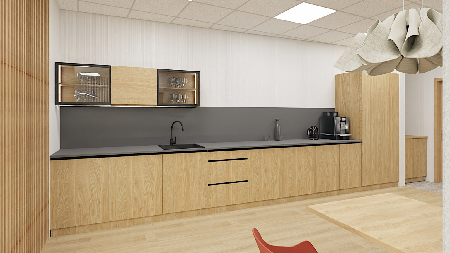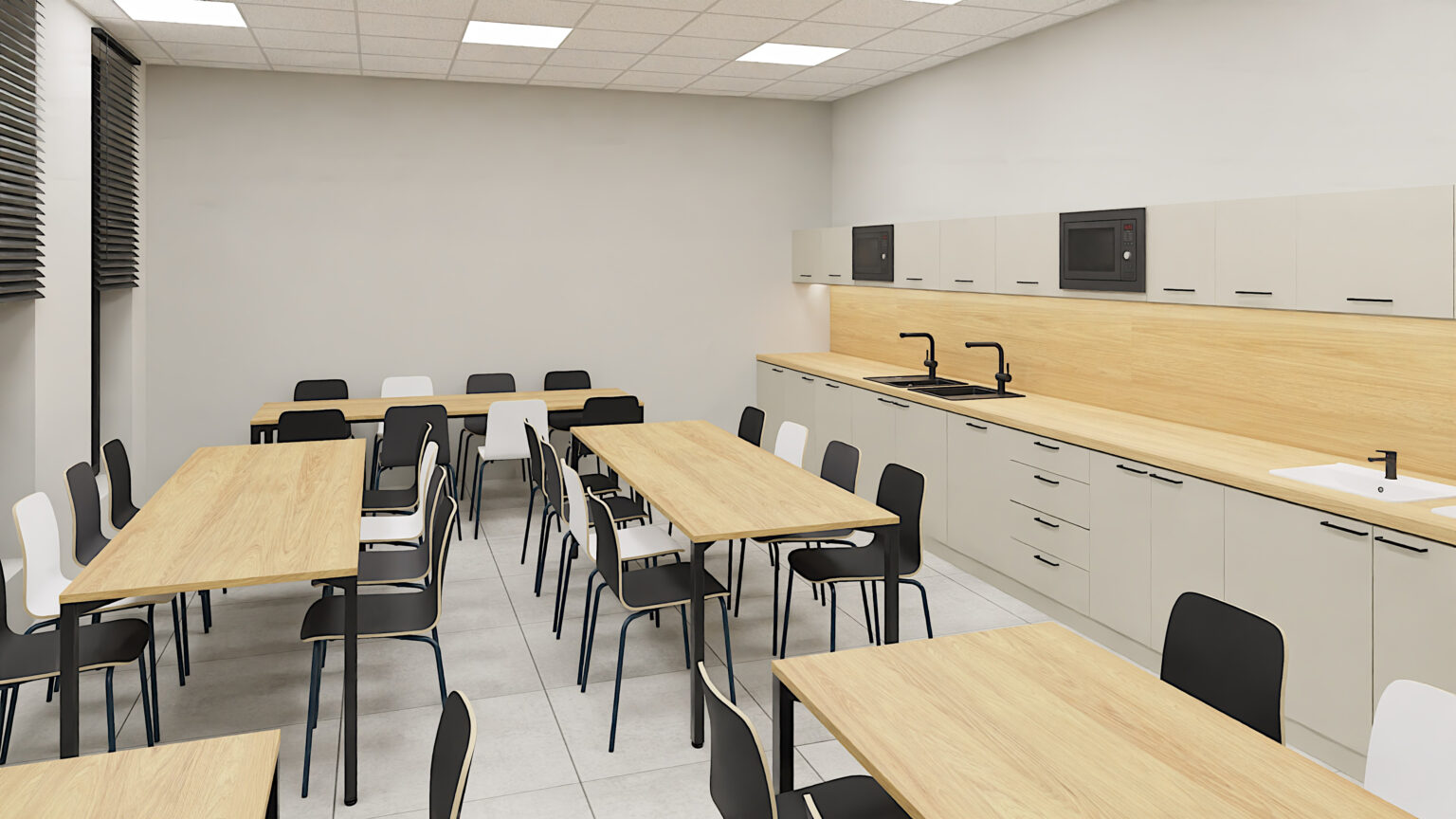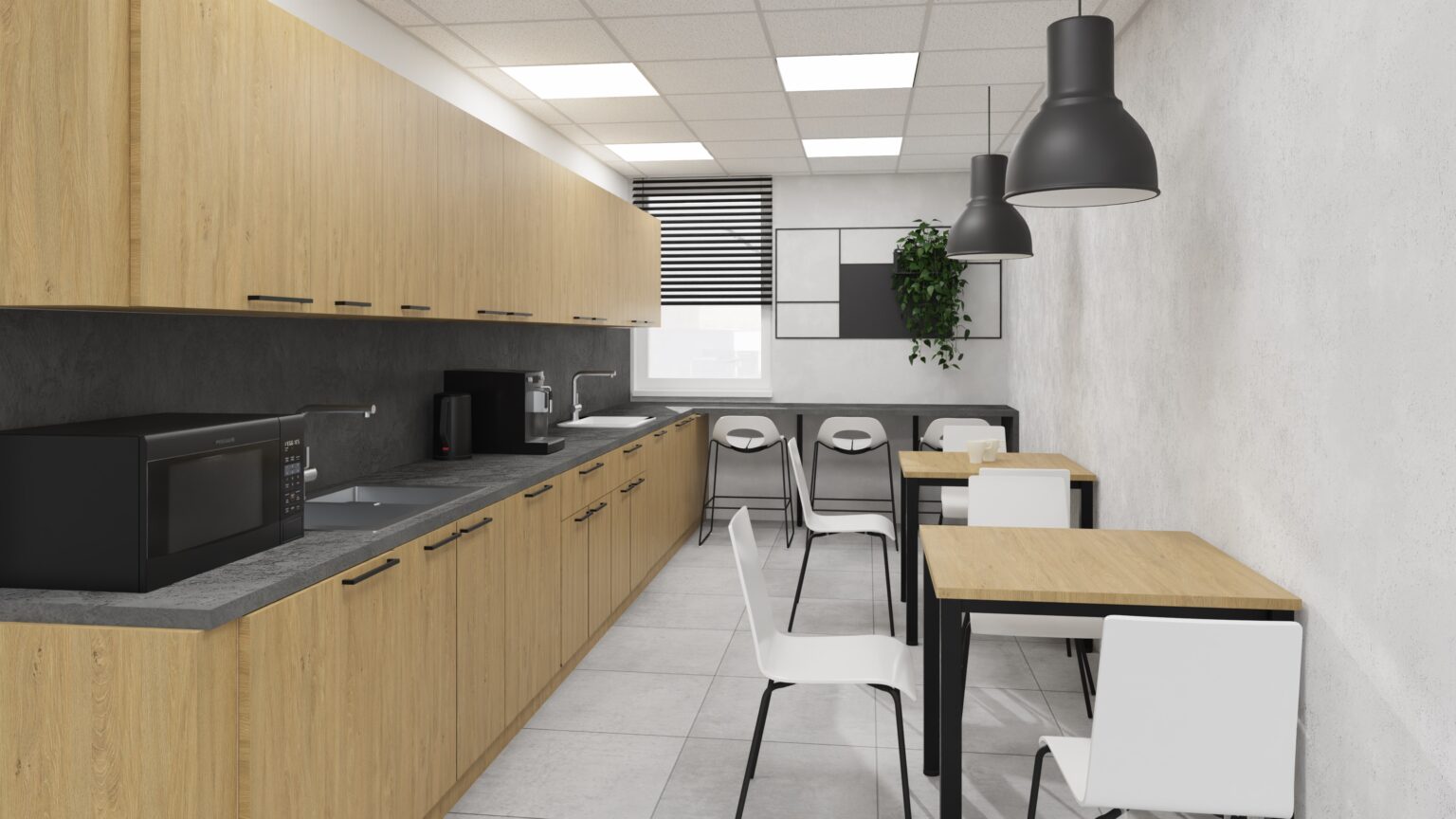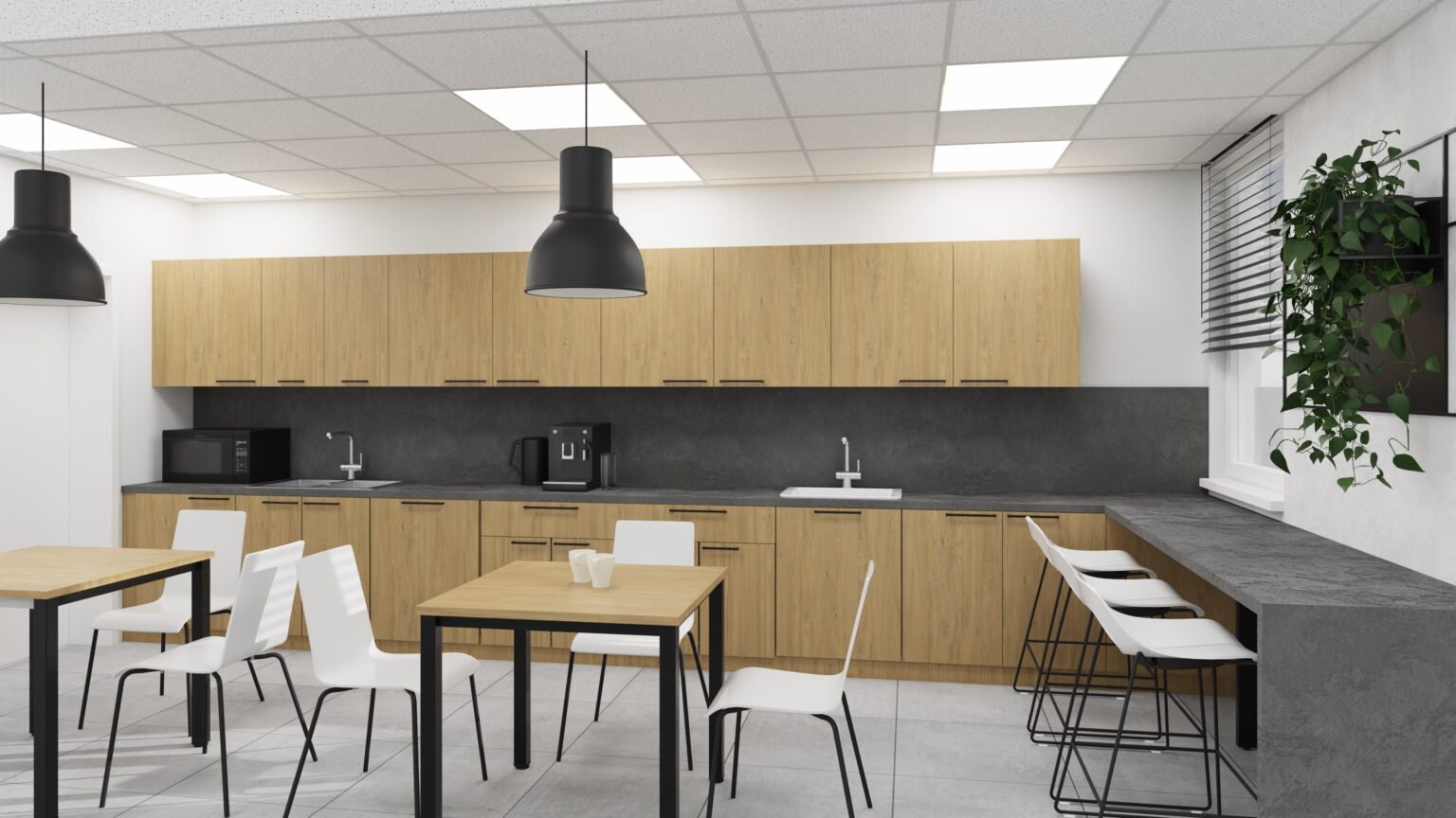 Kantyna powinna odpowiadać na różnorodne potrzeby — mikrofale, ekspresy do kawy, lodówki, stacje z wodą pitną, zmywarki czy bufet samoobsługowy. Projektujemy ją tak, by korzystanie z urządzeń i obsługa była szybka i intuicyjna, a przestrzeń łatwa w utrzymaniu czystości.