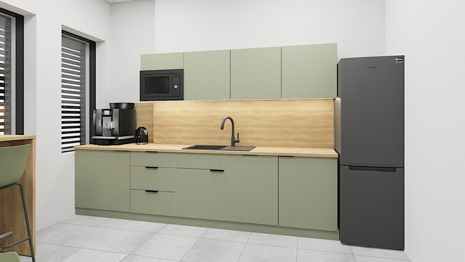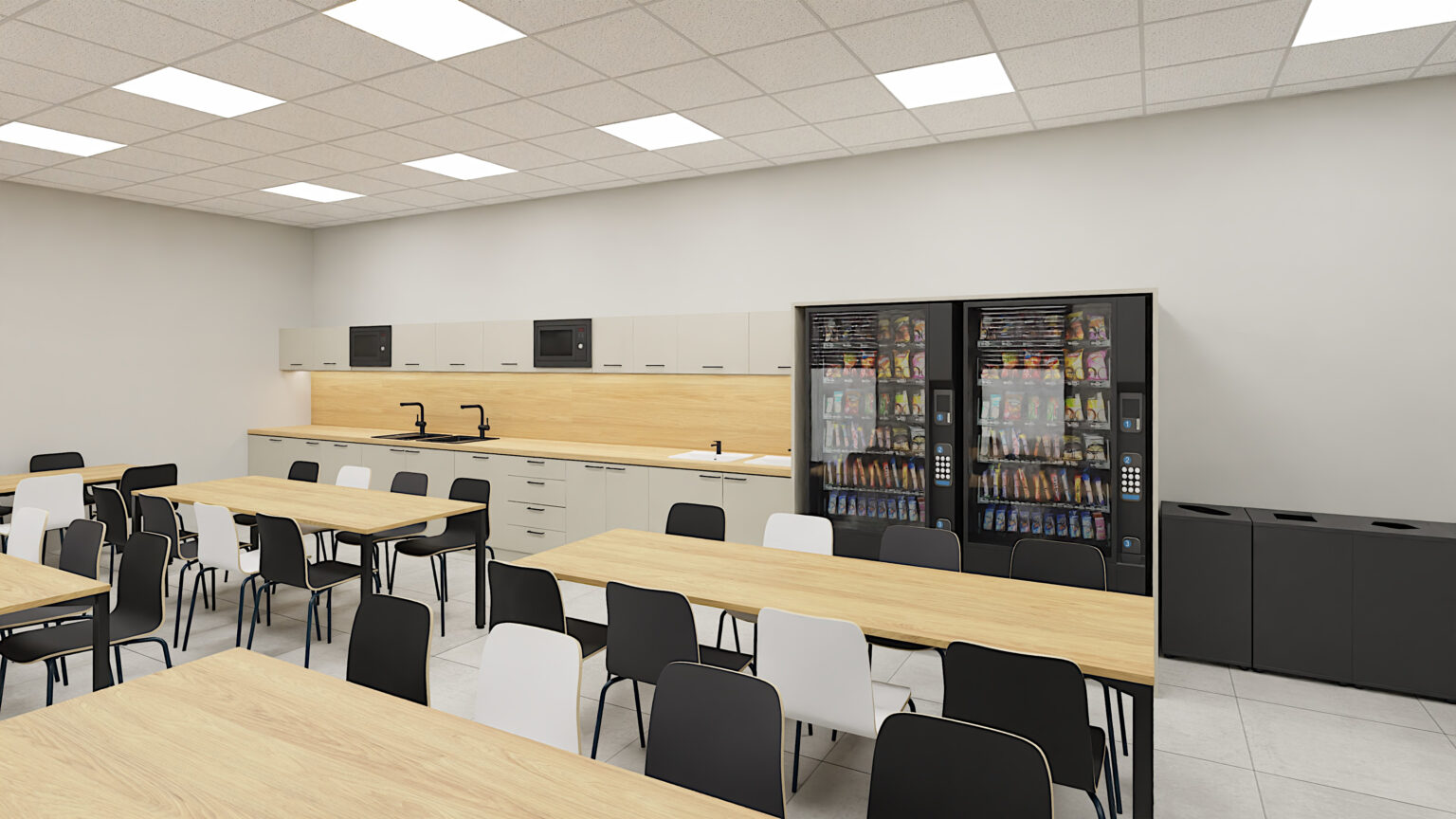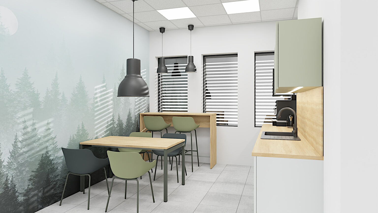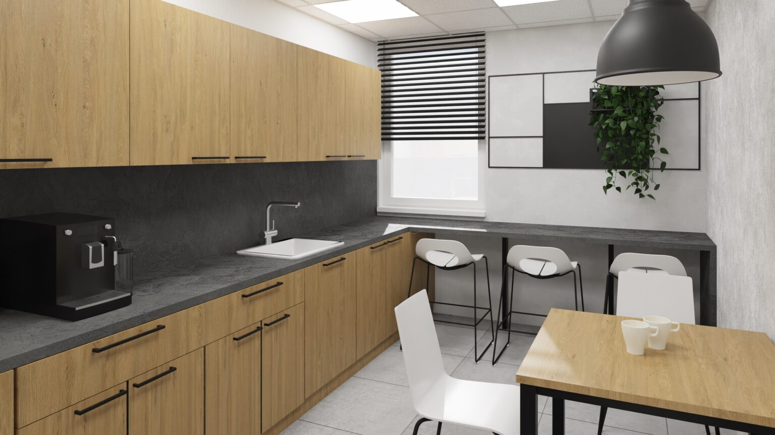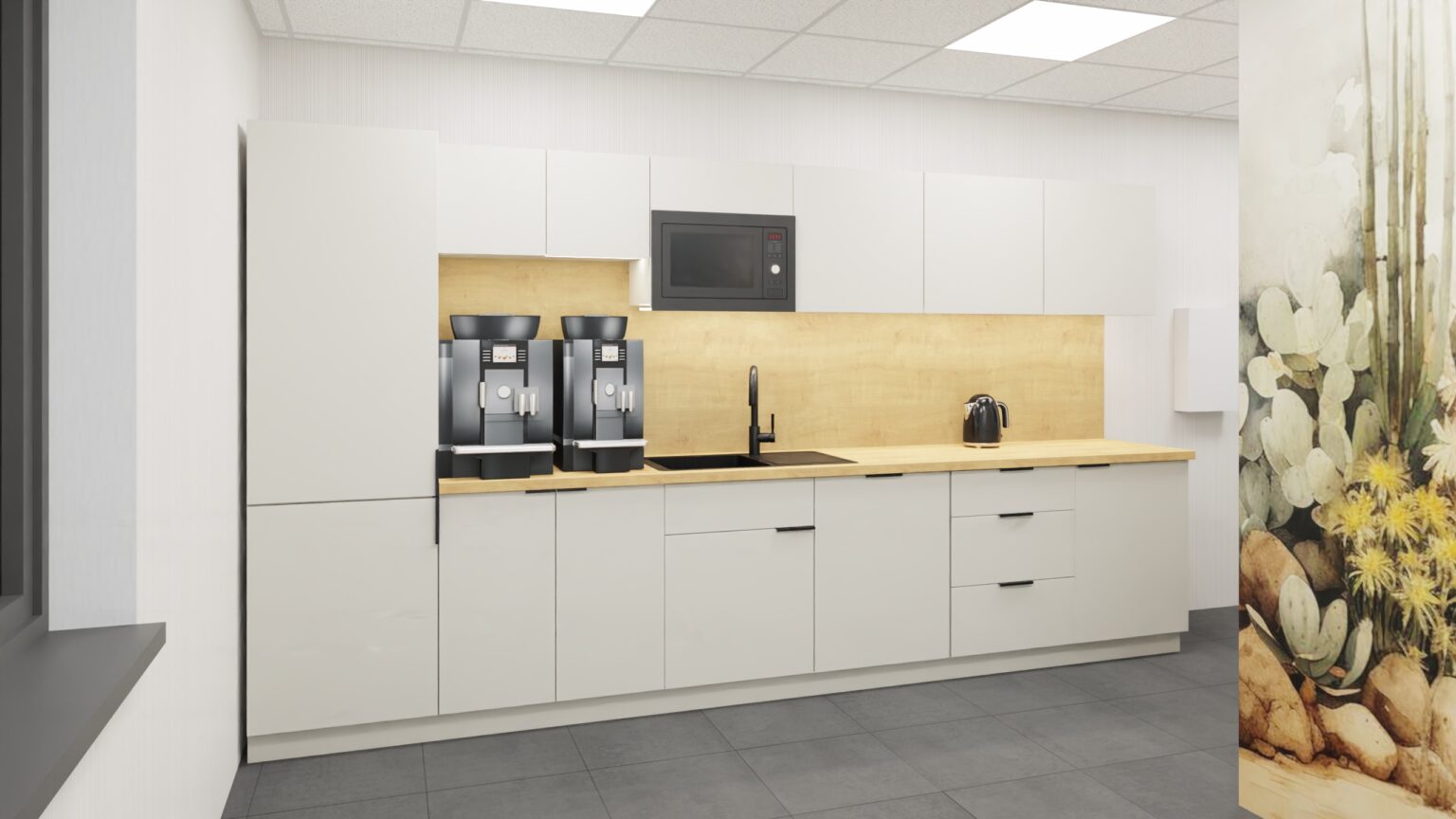 Kantyna powinna odpowiadać na różnorodne potrzeby — mikrofale, ekspresy do kawy, lodówki, stacje z wodą pitną, zmywarki czy bufet samoobsługowy. Projektujemy ją tak, by korzystanie z urządzeń i obsługa była szybka i intuicyjna, a przestrzeń łatwa w utrzymaniu czystości.