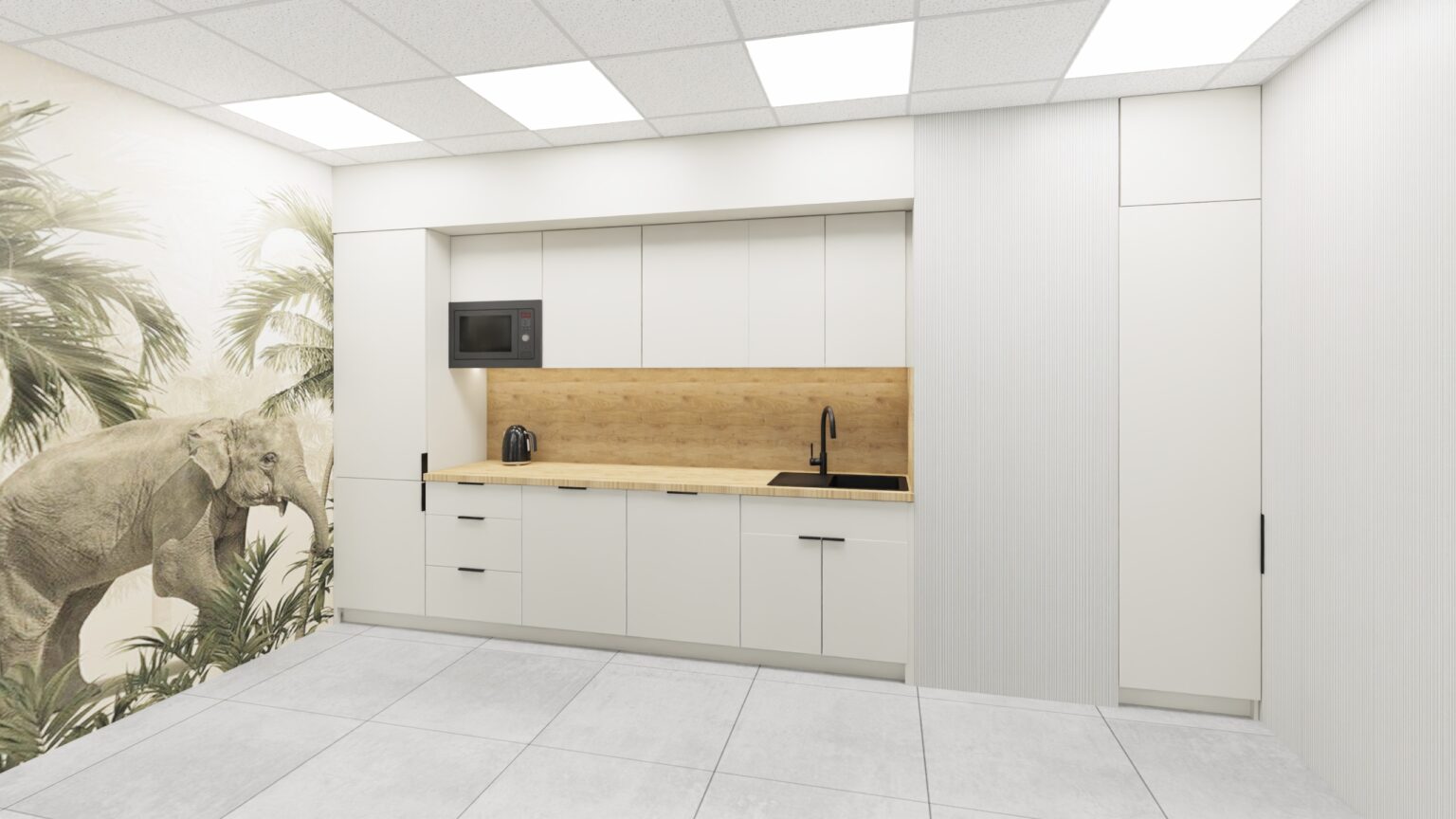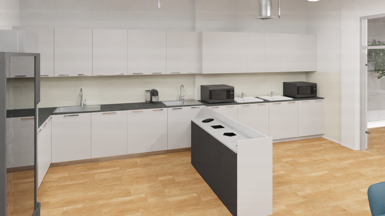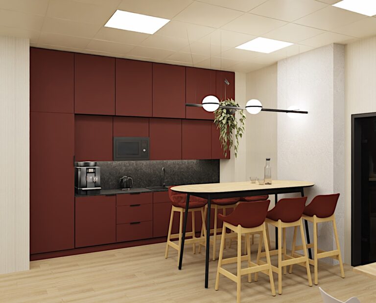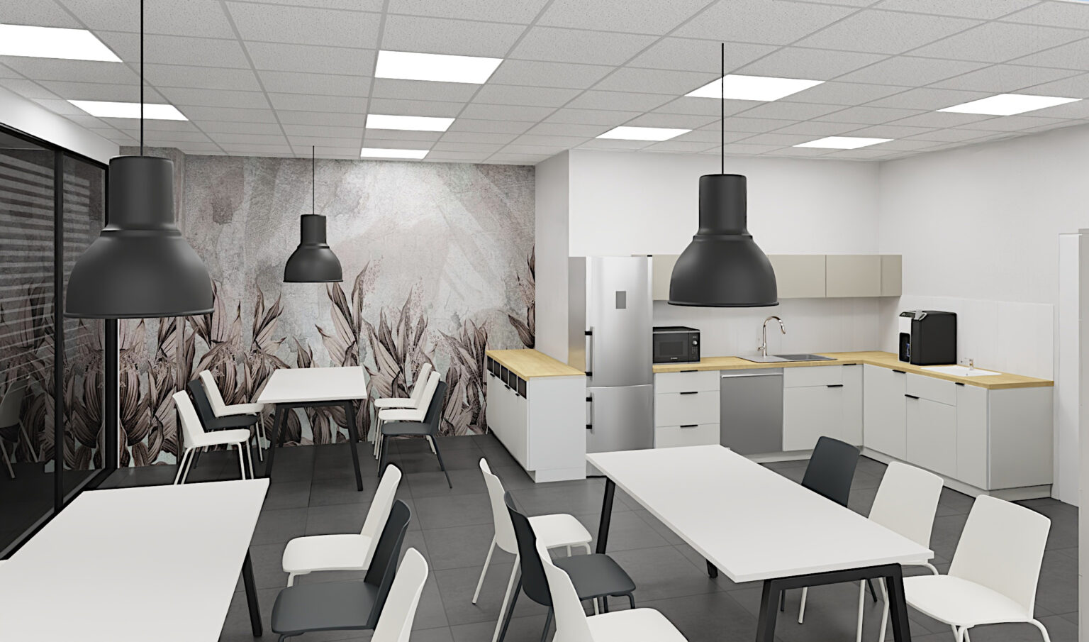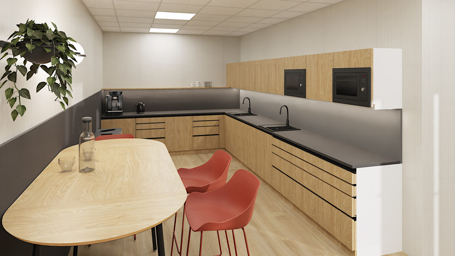 Kantyna powinna odpowiadać na różnorodne potrzeby — mikrofale, ekspresy do kawy, lodówki, stacje z wodą pitną, zmywarki czy bufet samoobsługowy. Projektujemy ją tak, by korzystanie z urządzeń i obsługa była szybka i intuicyjna, a przestrzeń łatwa w utrzymaniu czystości.