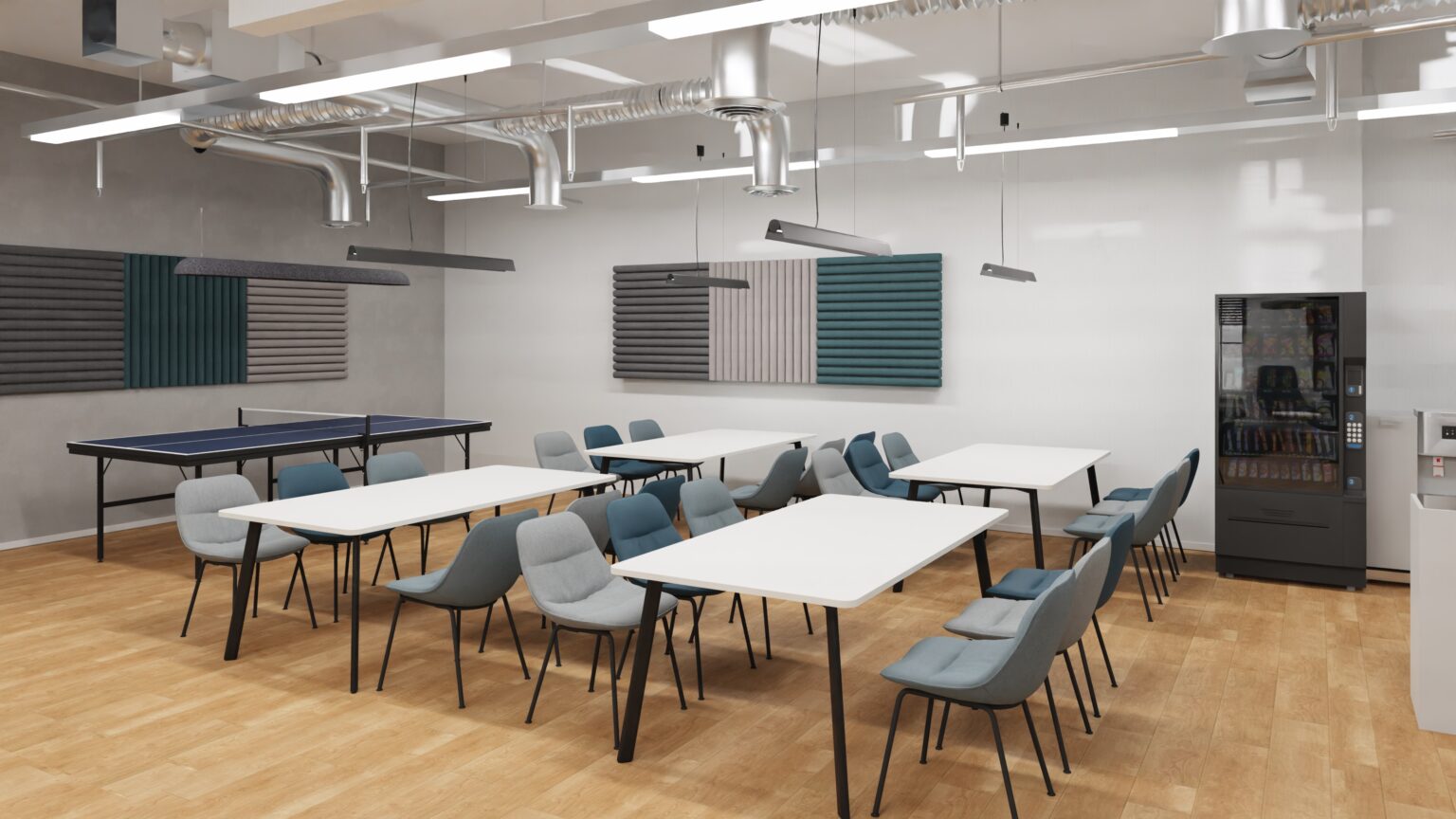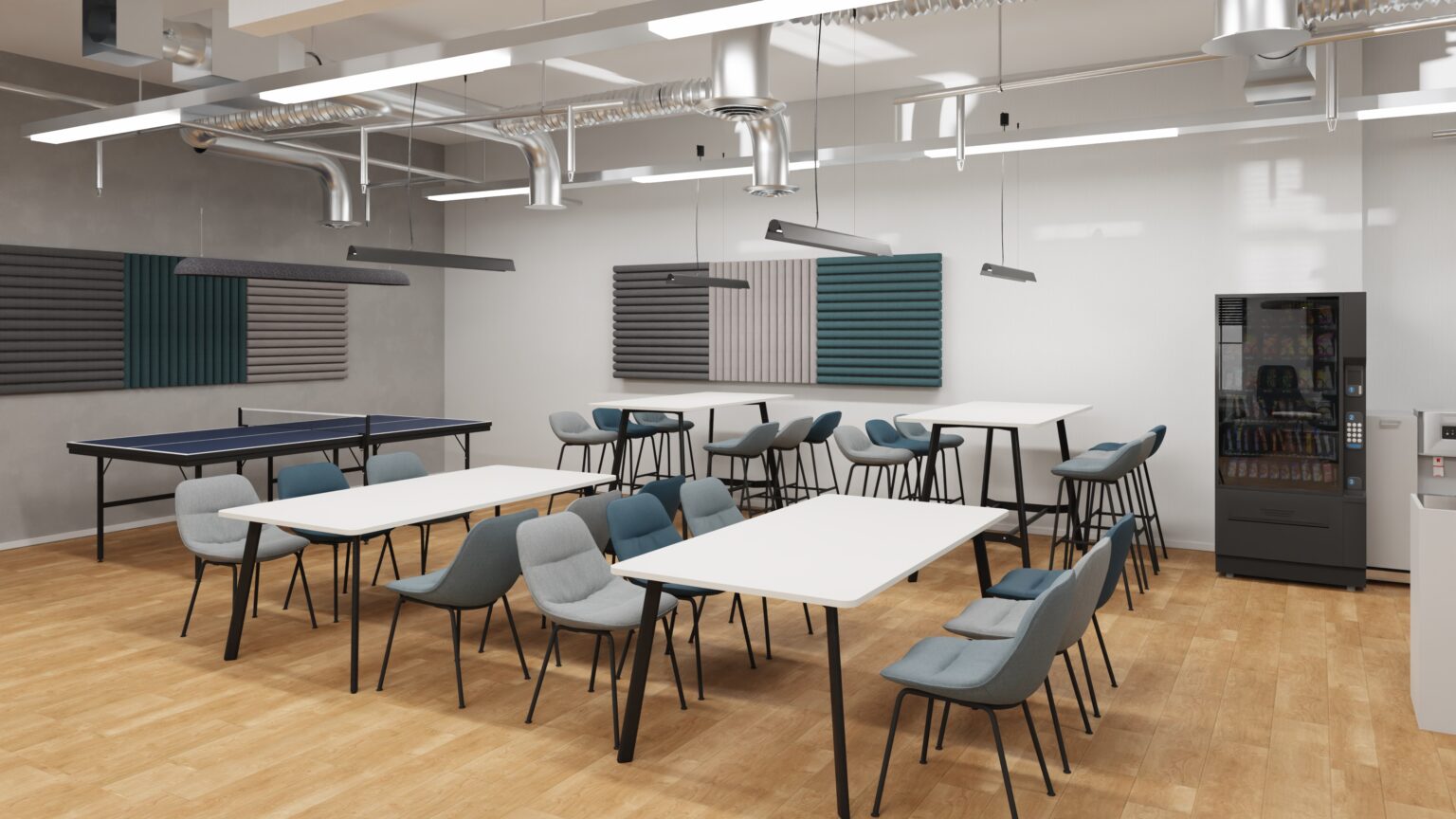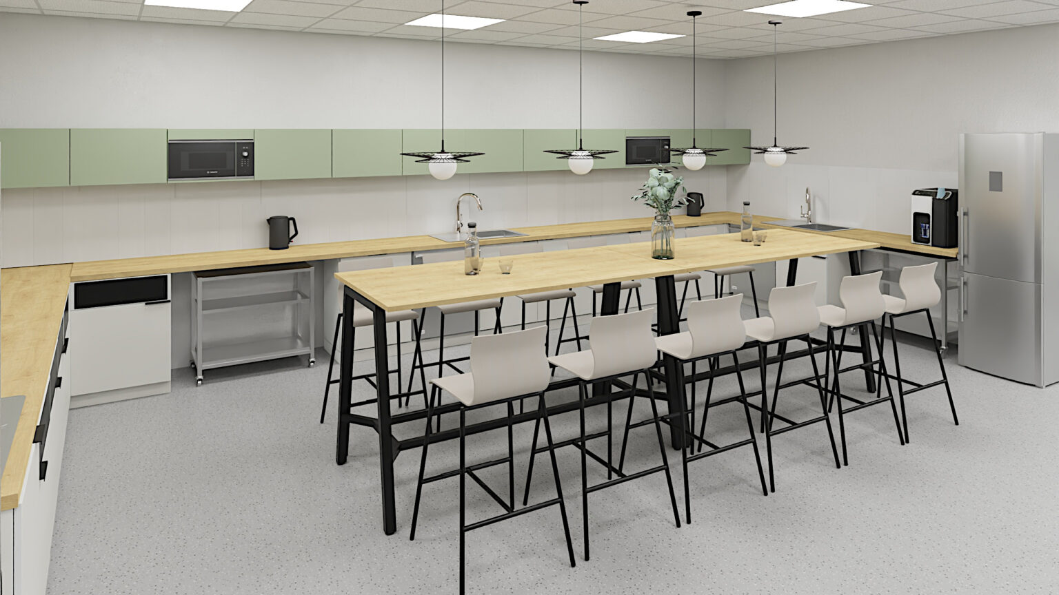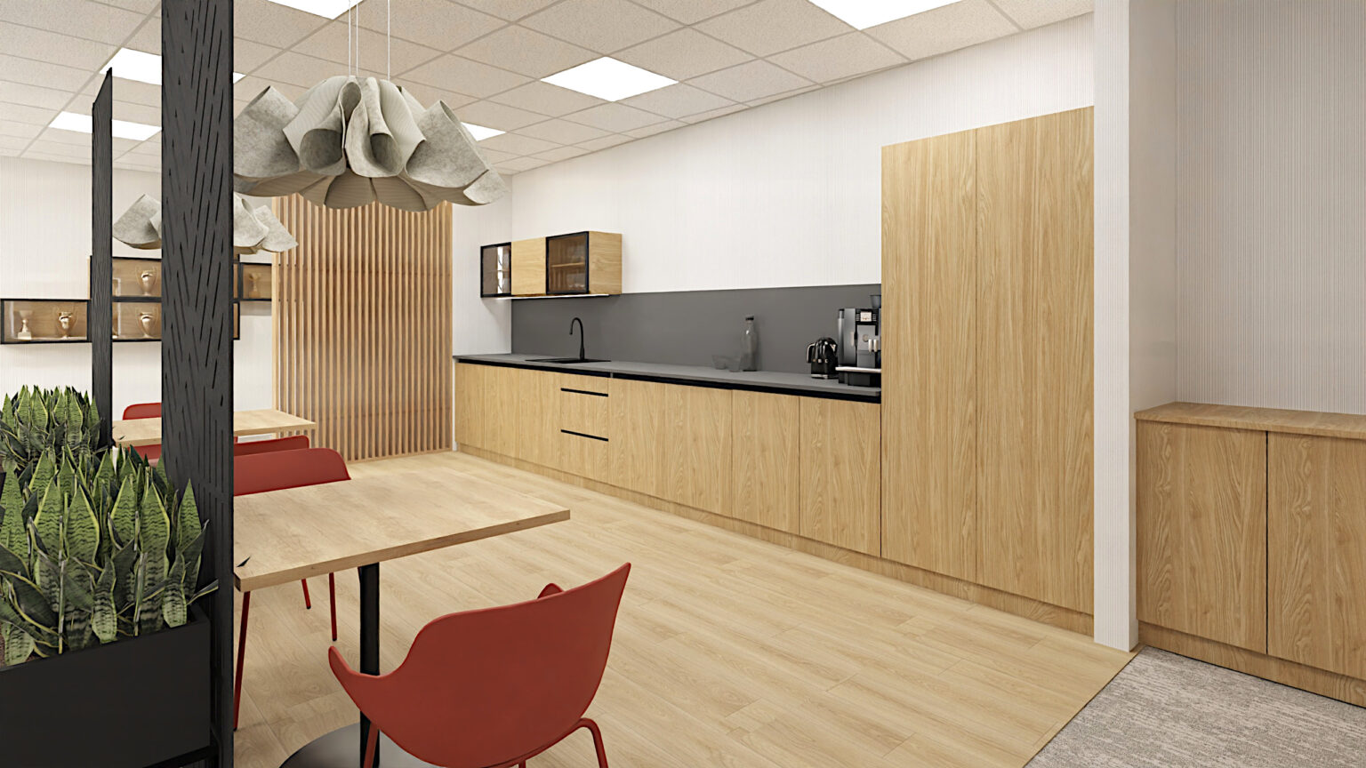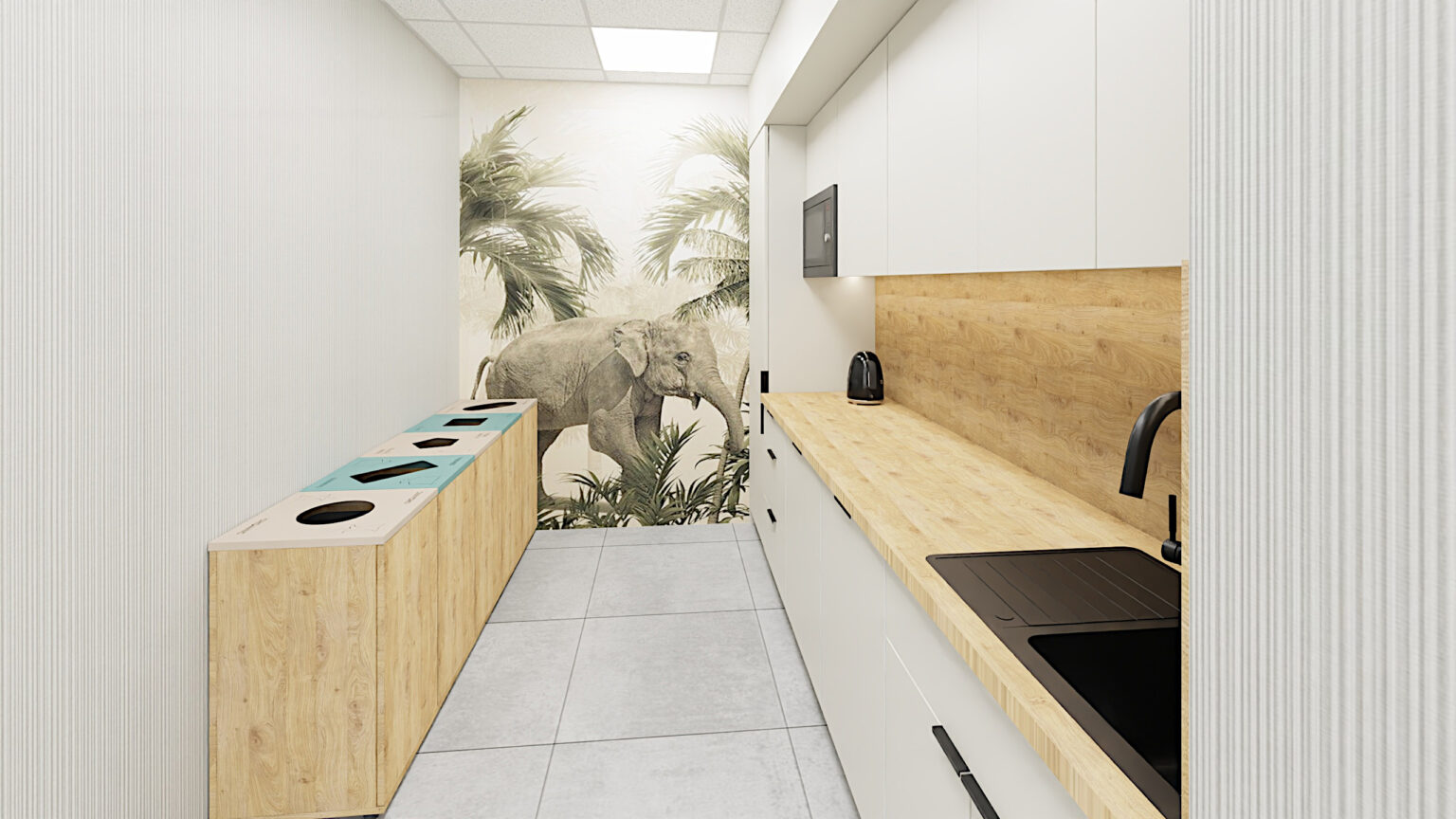 Kantyna powinna odpowiadać na różnorodne potrzeby — mikrofale, ekspresy do kawy, lodówki, stacje z wodą pitną, zmywarki czy bufet samoobsługowy. Projektujemy ją tak, by korzystanie z urządzeń i obsługa była szybka i intuicyjna, a przestrzeń łatwa w utrzymaniu czystości.